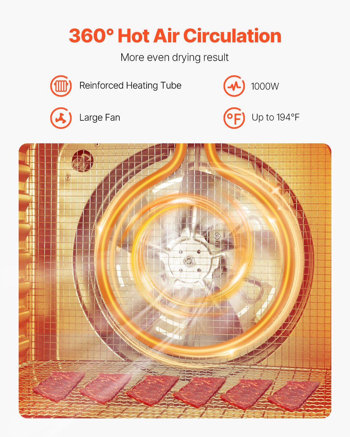 - Efficient & Even Drying: With an upgraded thickened heating tube and large fan, the heating tube generates heat while the fan circulates the warm air inside, evenly penetrating the food. The food dehydrator machine ensures even drying while preserving nutrients without loss