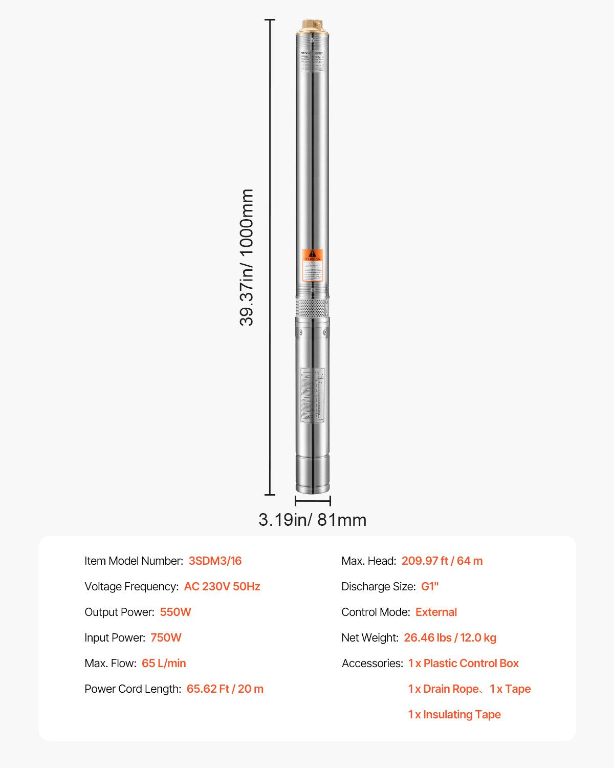 Deep Well Submersible Pump, 550W Output Power, 230V, 65 L/min Flow 64 m(210 ft) Head, with 20 m(65.62 ft) Cord External Control Box, Stainless Steel Water Pump, for Industrial Irrigation and Home Use, IP68