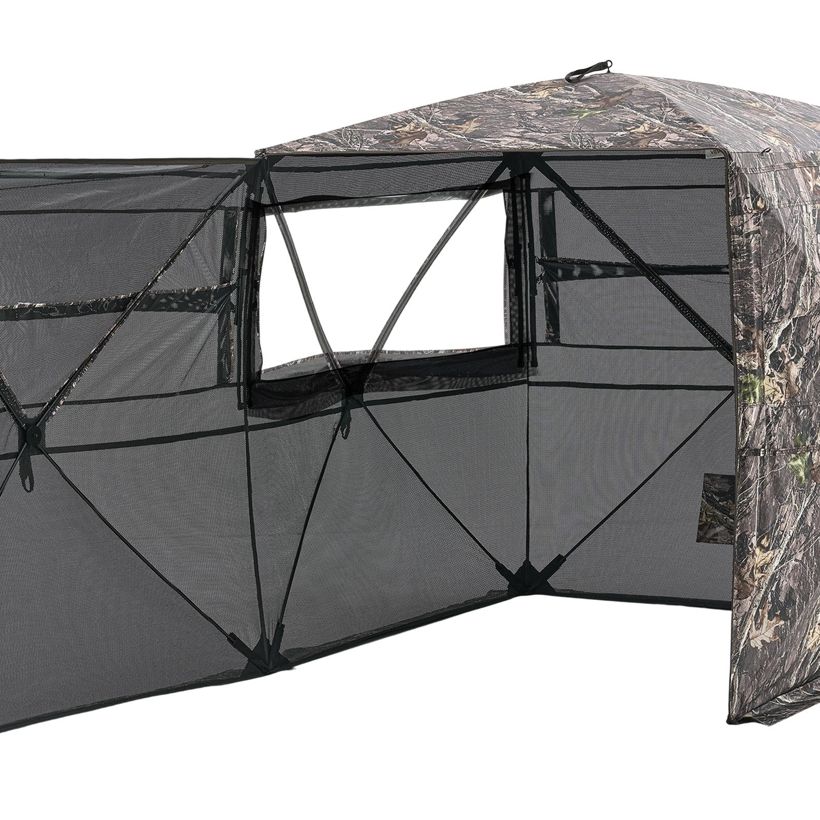 - Spacious Design: Dimension: 70x70x81 in. With large interior, our turkey deer blind tent can accommodates 4-5 people. Diamond-pattern warning fabric is detachable to increase visibility. It provides standing experience, 270°/360° two-way view