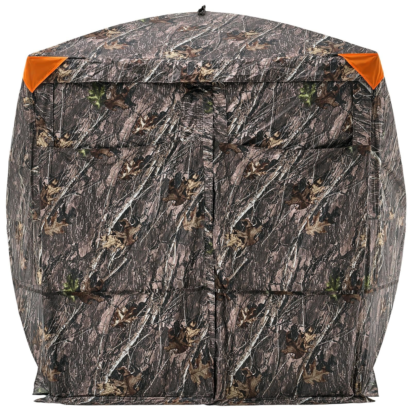 - Spacious Design: Dimension: 70x70x79 in. With large interior, our turkey deer blind tent can accommodates 4-5 people. Diamond-pattern warning fabric is detachable to increase visibility. It provides standing experience, 270°/360° two-way view