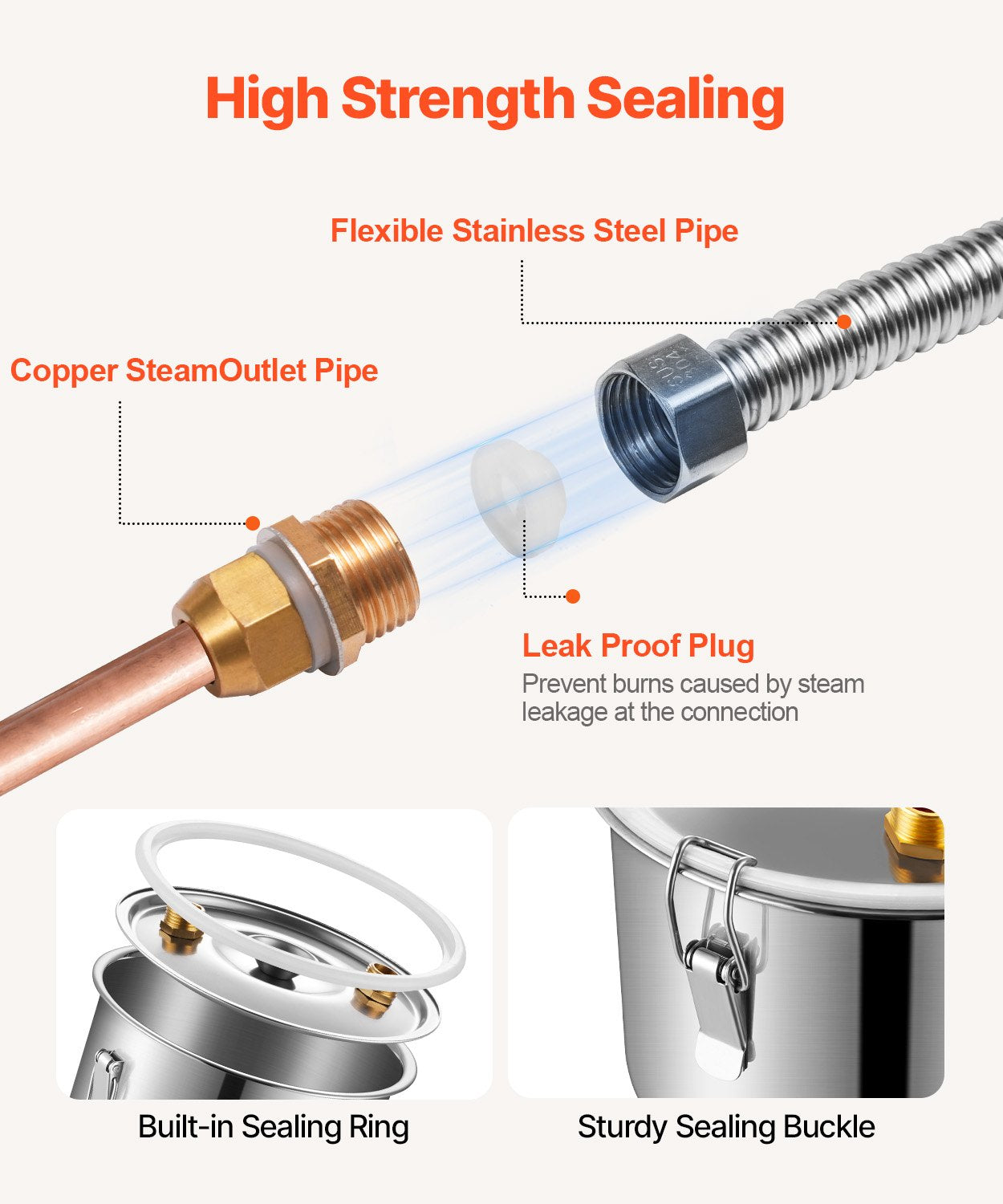 - Secondary Distillation System: A thumper keg is added in front of the cooling pot, delivering purer and richer flavors. The thumper keg is used for secondary distillation to produce whiskey or other spirits with higher purity. You can also add various flavoring ingredients to enhance the complexity of the finished wine.