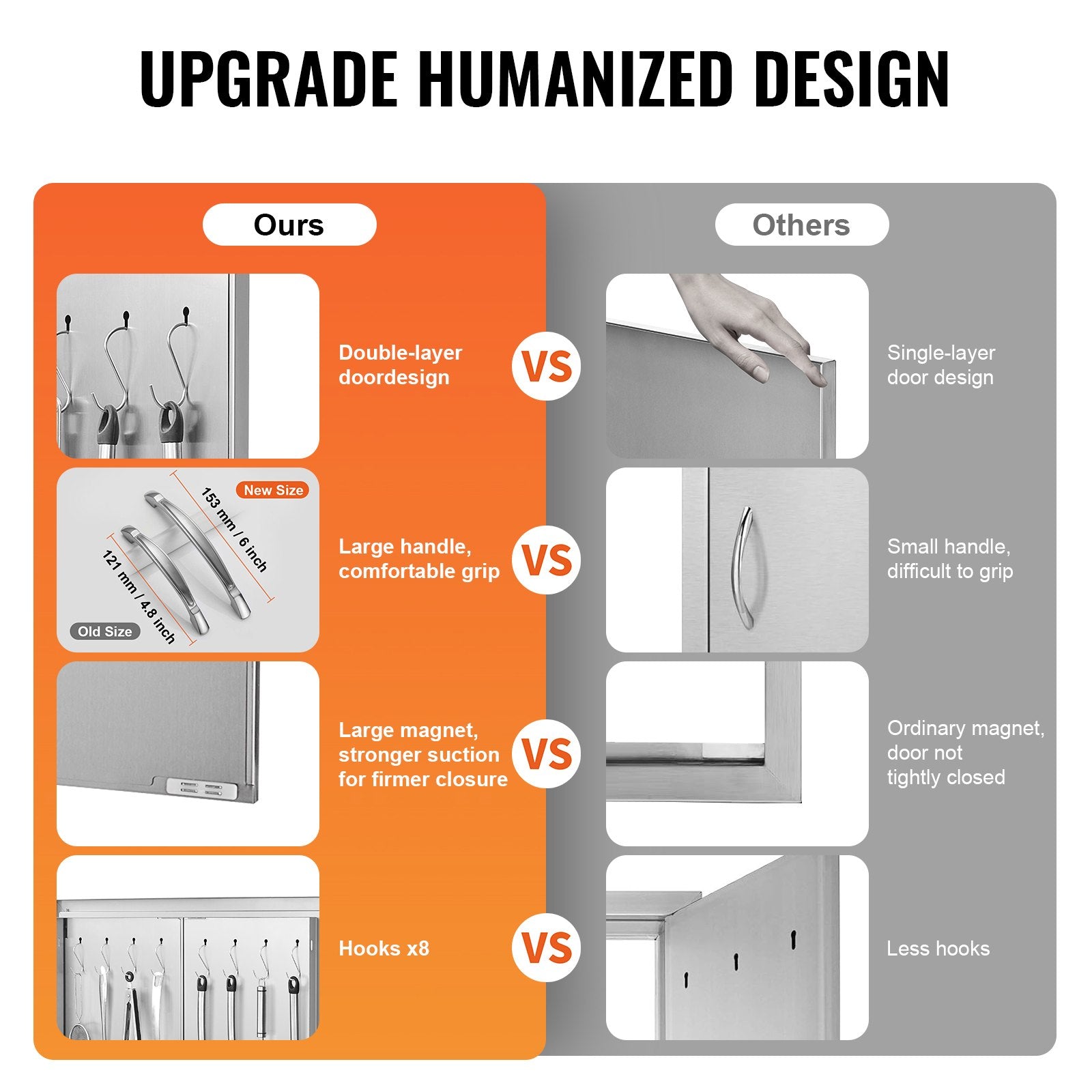 - Humanized Design: Featuring a hidden handle design, making the door look better and reducing the chance of accidental bruising. The door frame edges are bent and thickened for safer use. Added hooks allow you to store more items. It provides you a more user-friendly experience, allowing you to enjoy cooking in your outdoor kitchen without worries.
