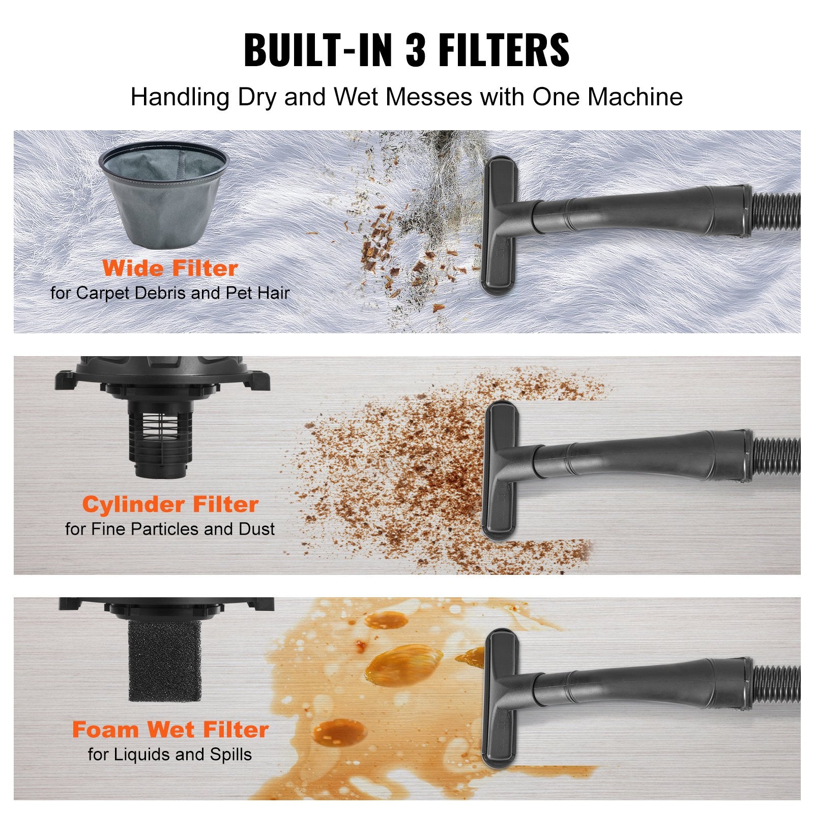 - Cleaner Air, for Fewer Worries: VEVOR's small shop vac adopts a reusable and washable cloth filter and a foam filter for wet and dry vacuum jobs. The upgraded cloth filter is better than traditional filters that are prone to wear and tear. They can be easily assembled or disassembled. The advanced filter can catch most debris, protecting your family from polluted air.