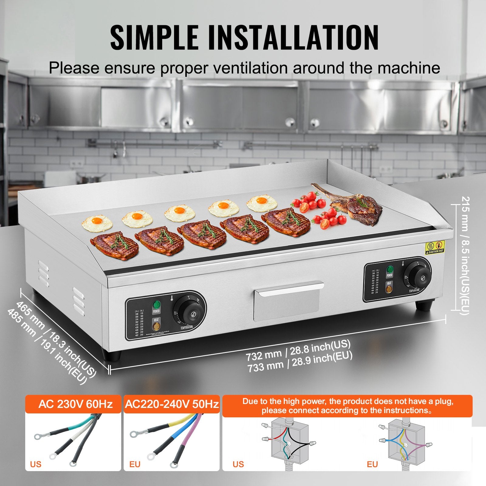 - Even Heating: The commercial electric griddle features an upgraded thickened 10mm / 0.39in iron cooking plate. The U-shaped dense heating tubes are evenly distributed, ensuring uniform temperature across the entire grill. The high-power setting allows for rapid heating of food.
