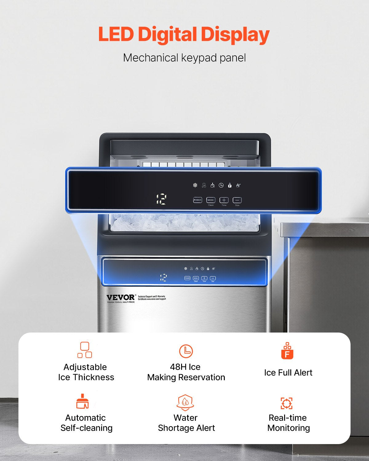 - Smart Control Panel: Our commercial ice maker features an LED digital display and mechanical buttons, giving you precise control over the ice-making process. Adjust ice thickness by increasing or decreasing ice-making time effortlessly. And that's not all - it also comes with a one-touch automatic cleaning function, making machine maintenance a breeze. You can monitor the status of the ice maker in real-time with the indicator light on the panel