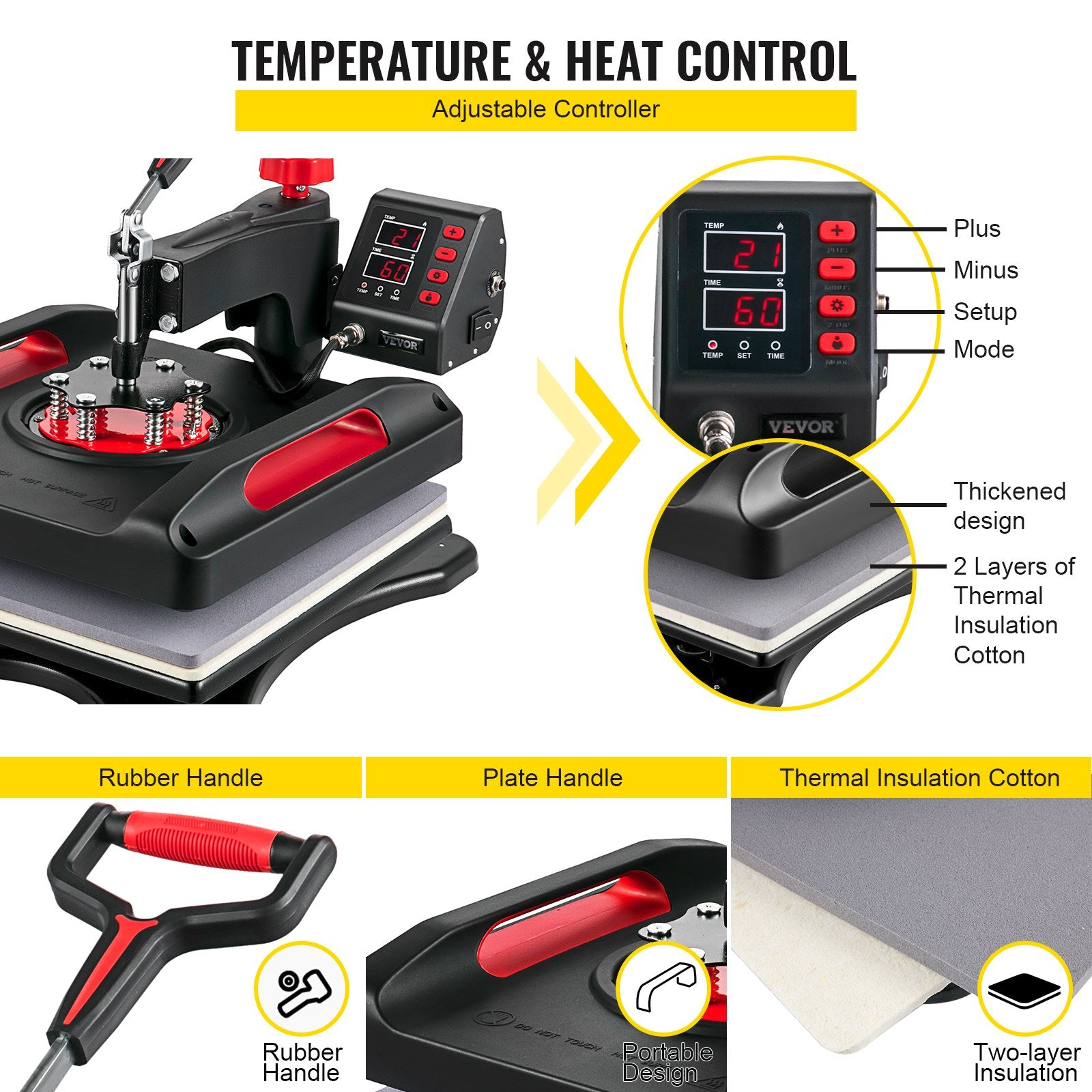 - 【5-IN-1 VERSATILE KIT】- With a 15"x 15" (38 x 38 cm) large heat platen, the 5 in 1 heat press uses Teflon-coated platen, non-stick & stable. Suitable for applying letters, numbers, and patterns onto caps, T-shirts, mugs, plates, etc.