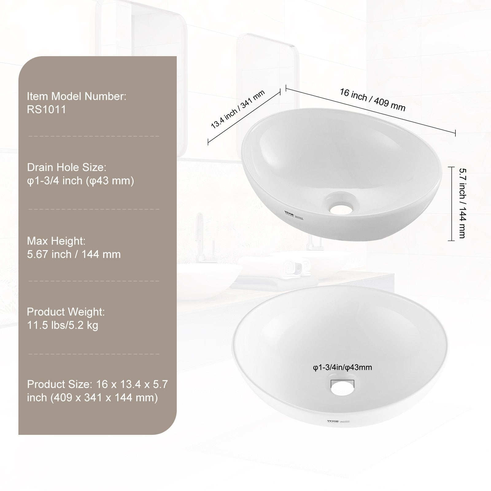 - Drain Hole Size: φ1-3/4 inch (φ43 mm)