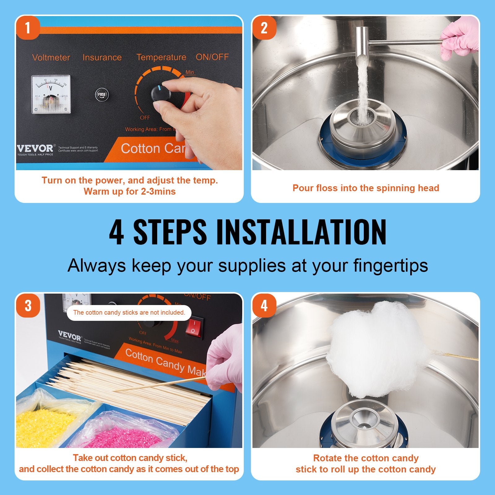 - Easy-Operating Process: Using this machine couldn't be easier. Turn on the power, adjust the temperature, warm up for 2-3 minutes, and pour sugar into the spinning head, and then you just need to use the sticks to collect the cotton candies from the head.