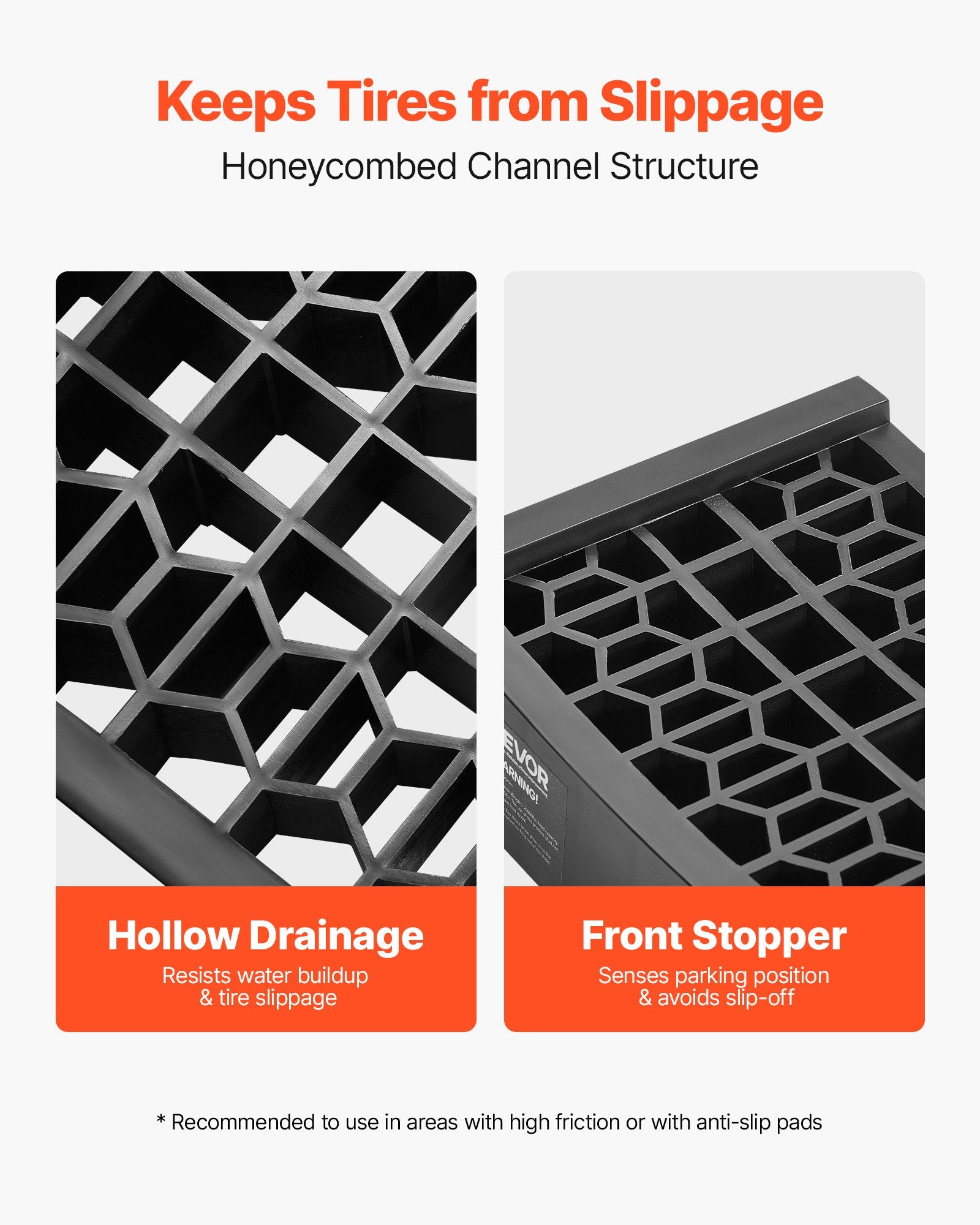 - Special Design: Our oil change ramps feature a honeycombed surface to increase friction and improve drainage, which reduces dampness buildup and tire slippage. The curved shape fits the tire securely, keeping the vehicle stable and fixed in place