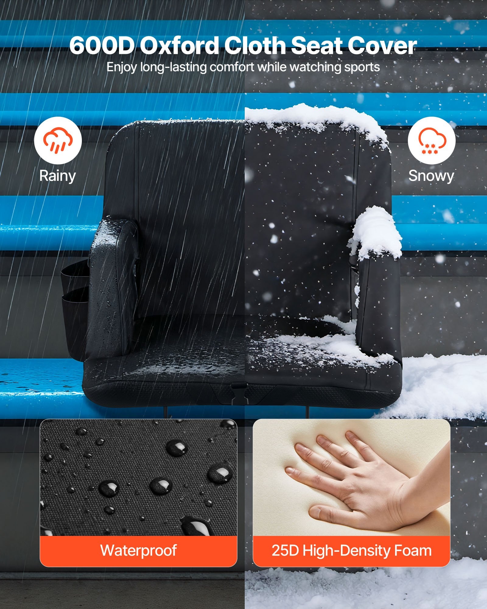 - Comfortable Wide Seat: Made from lightweight steel, thick high-density foam, and 600D waterproof Oxford cloth, our bleacher stadium chair is built to last and easy to clean. The 23-inch/584.2mm wide seat and supportive back offer lasting comfort during hours of sports or outdoor events