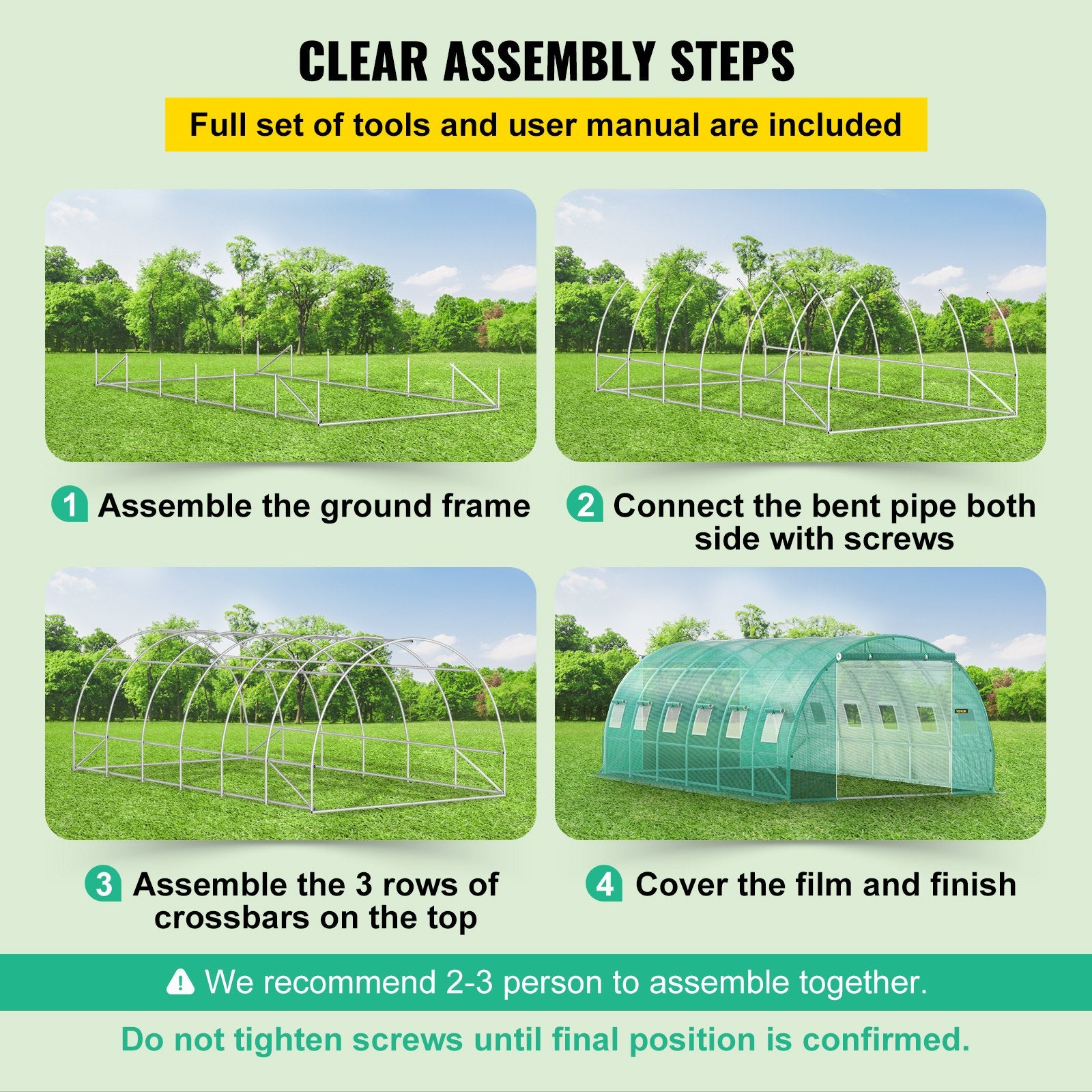 - All Tools Included: The hoop house greenhouse is easy to assemble with connectors, and screw covers can prevent scratches and rust.Includes 4 ropes, stakes, and guy ropes for added security, stability, and strength. Note: Do not tighten screws until the final position is confirmed.