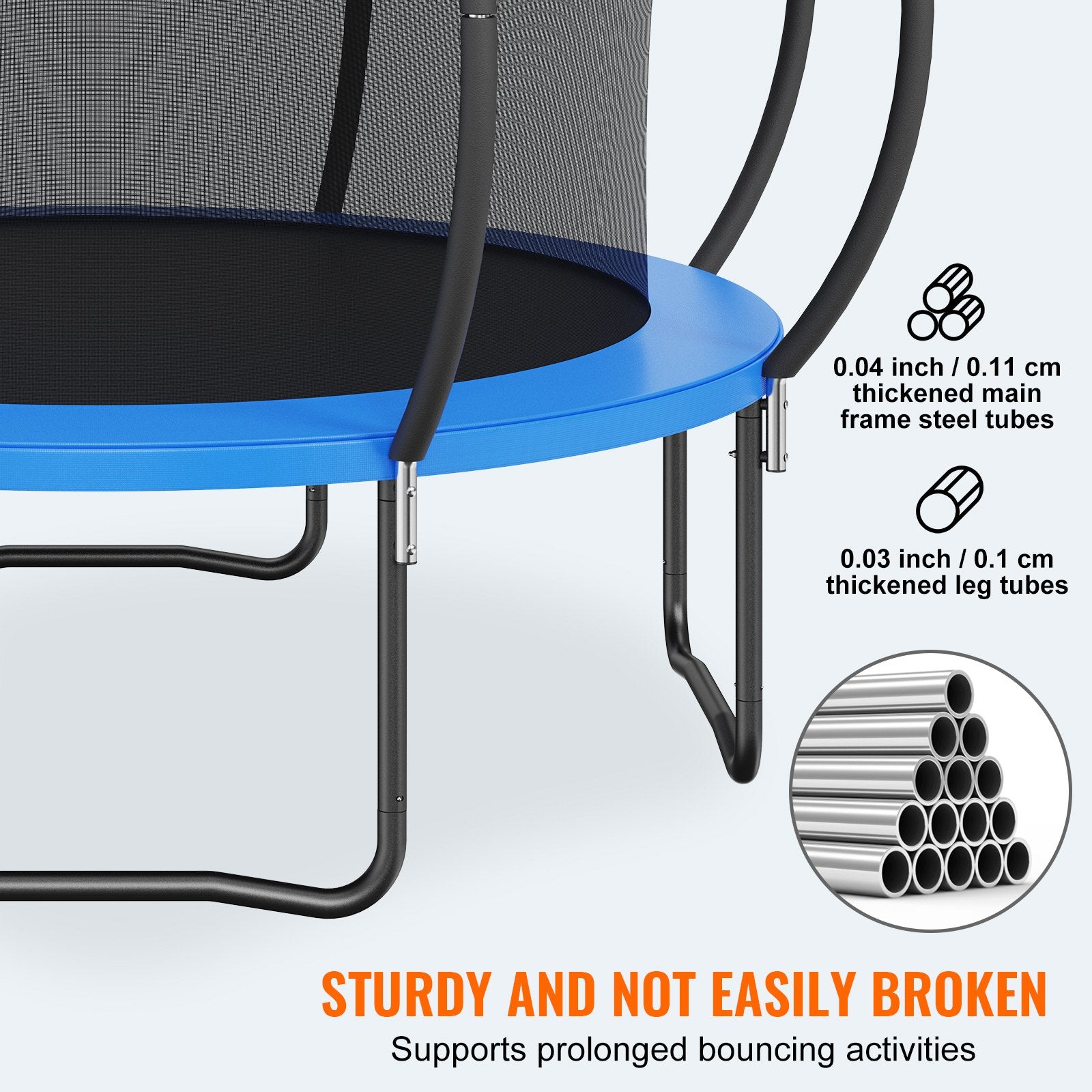 - Durable and Resistant to Bending: This recreational trampoline is made with upgraded high-quality materials. Its ring leg design with thickened steel tubes ensures even and firm support, making it resistant to bending even with prolonged use. The trampoline has undergone rigorous testing and can withstand a weight of around 330 lbs / 150 kg, making it suitable for children to bounce on.