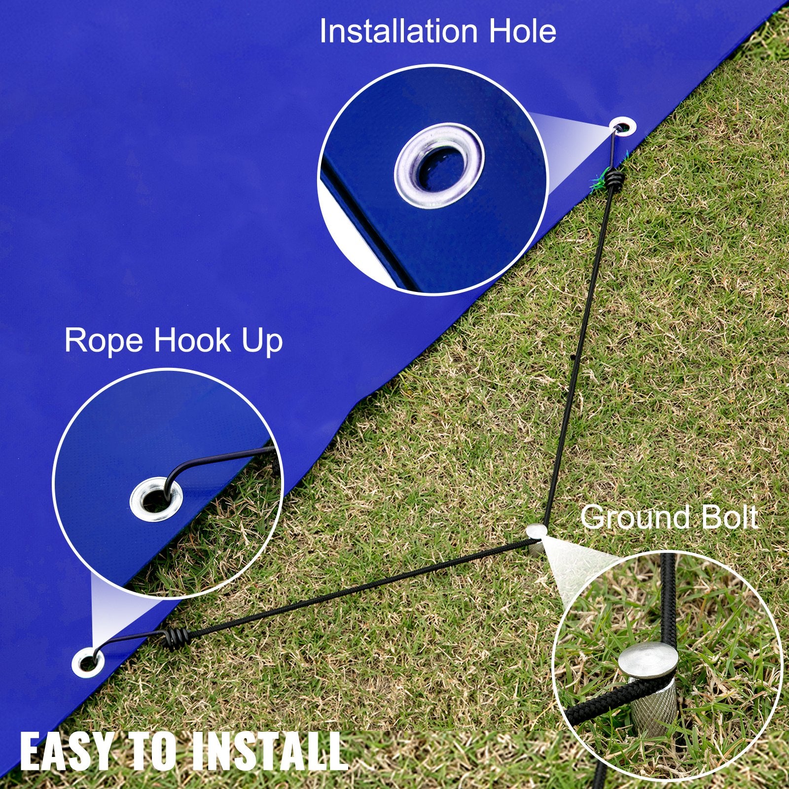 - Easy Installation: The rectangle inground pool cover is securely fastened to the pool using ropes connected to the PVC cover. One end is secured with detachable ground bolts, while the other end has corresponding connectors for easy stretching over the pool.