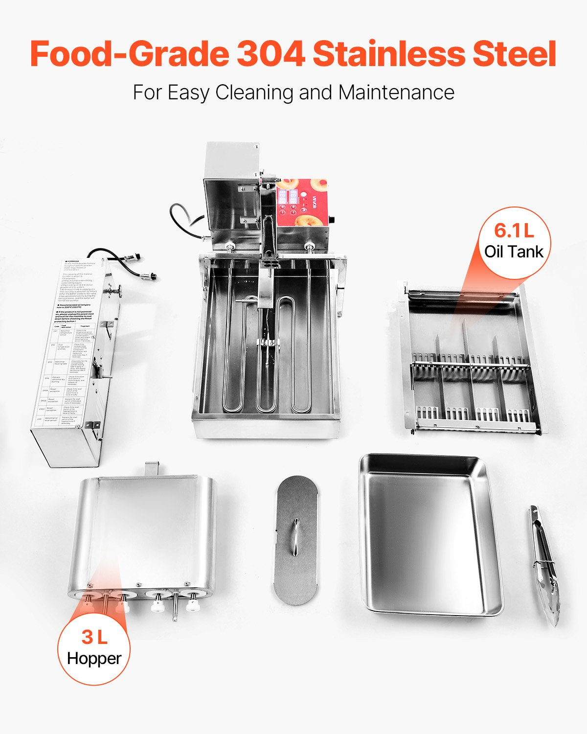 - Food-Grade Stainless Steel: Constructed with 304 stainless steel, this frying donuts maker is easy to clean and maintain. Featuring a 3L hopper and a 6.1L oil tank, it's designed for high-volume production without constant refilling