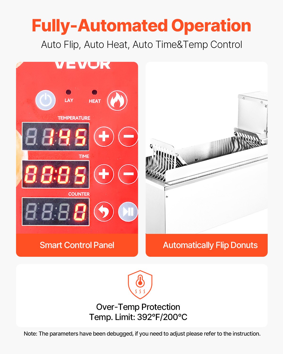 - Fully-Automated Operation: This donuts making machine comes with a smart control panel that makes it easy for your team to produce consistent donuts with minimal effort. It features automated donut flipping to ensure even cooking. Simply set it, and let the machine do the work