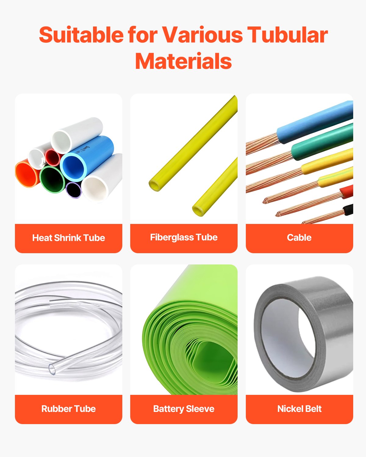- Wide Applications: Our heat-shrink tubing cutter is designed to handle a wide range of tubular materials, including heat shrink tubes, fiberglass tubes, cables, yellow wax tubes, rubber tubes, PTFE tubes, battery sleeves, nickel belts, etc. It ensures precise cuts, improving efficiency and delivering flawless results for your cutting tasks.