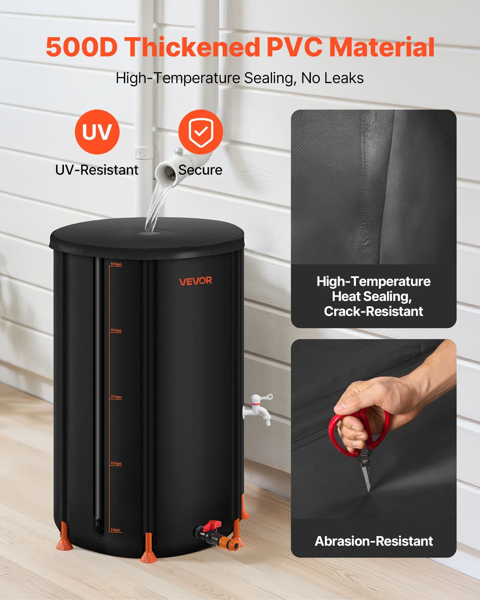 - Premium Quality: Our collapsible water barrel is made of durable 500D waterproof PVC. It is UV-resistant and non-toxic. High-temperature sealing ensures no leakage. With a temp range of -30℃ to +70℃, it works from cold winters to hot summers