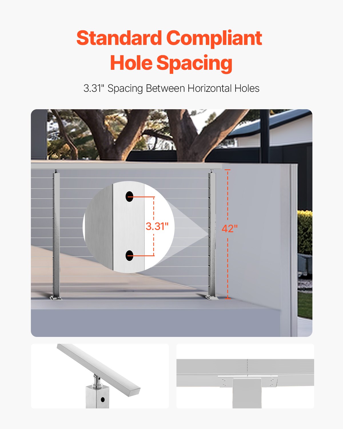 - Geländerpfosten mit horizontalen Löchern: Dieser Geländerpfosten mit horizontalen Löchern ist in den Höhen 42" und 36" erhältlich und verfügt über 0,31" und 0,41" große Löcher (insgesamt 10–12 Löcher). Er dient der horizontalen Geländerbefestigung auf dem Boden oder der Terrasse und bietet Ihnen und Ihrer Familie Sicherheit. Hinweis: Drahtseile sind nicht im Lieferumfang enthalten.