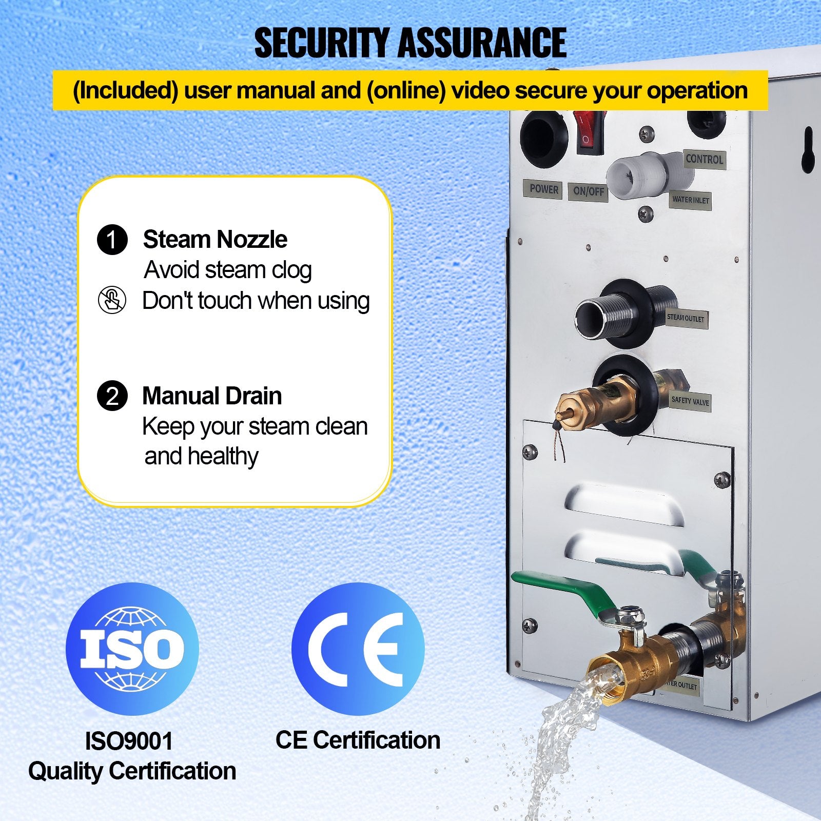- Mehrfacher Schutz: Bei Installations- und Bedienungsproblemen hilft Ihnen das im Benutzerhandbuch enthaltene Online-Video. Die Dampfdüse verhindert zudem Verstopfungen, und der manuelle Ablass sorgt für einen sauberen Dampfreiniger. ISO 9001-Qualität und CE-Zertifizierung inklusive.