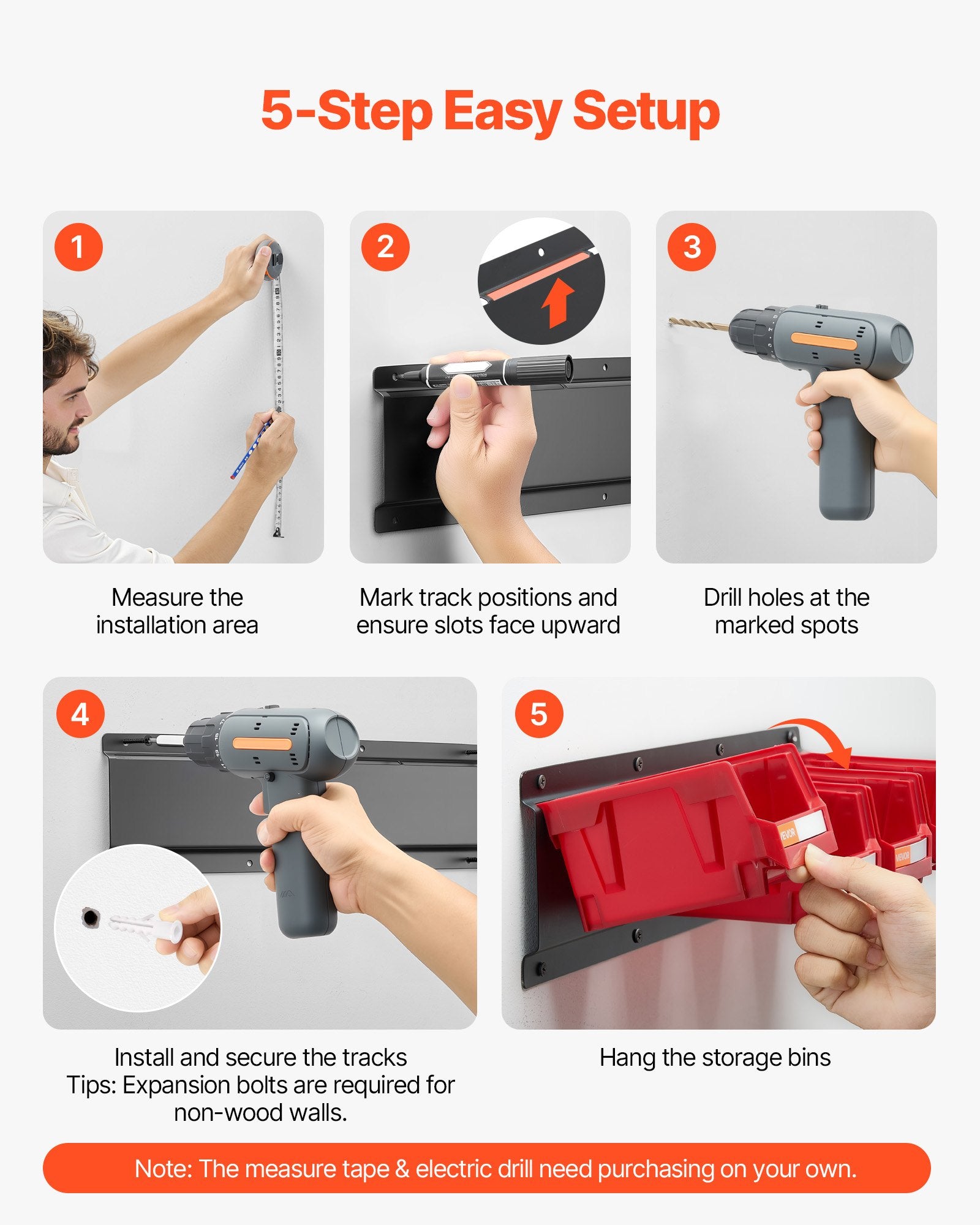 Wandmontierte Aufbewahrungsboxen, 12 Kunststoffboxen & 3 Metallschienen, stapelbare Hängeboxen aus Kunststoff für Schrauben, Muttern, Bolzen, Nägel, Werkzeugaufbewahrung für Werkstatt, Bastelraum, Garage, Rot