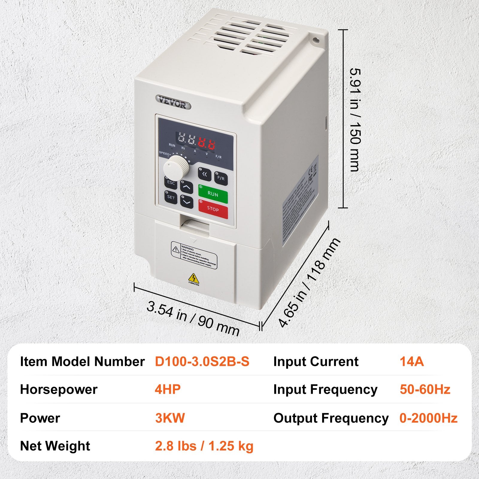 Frequenzumrichter 4 PS, 3 kW, 14 A, 1- oder 3-phasig, 220 V AC Eingang auf 3-phasig, 0–220 V AC Ausgang, 50/60 Hz Eingang, 0–2000 Hz Ausgang, zur Spindelmotor-Drehzahlregelung