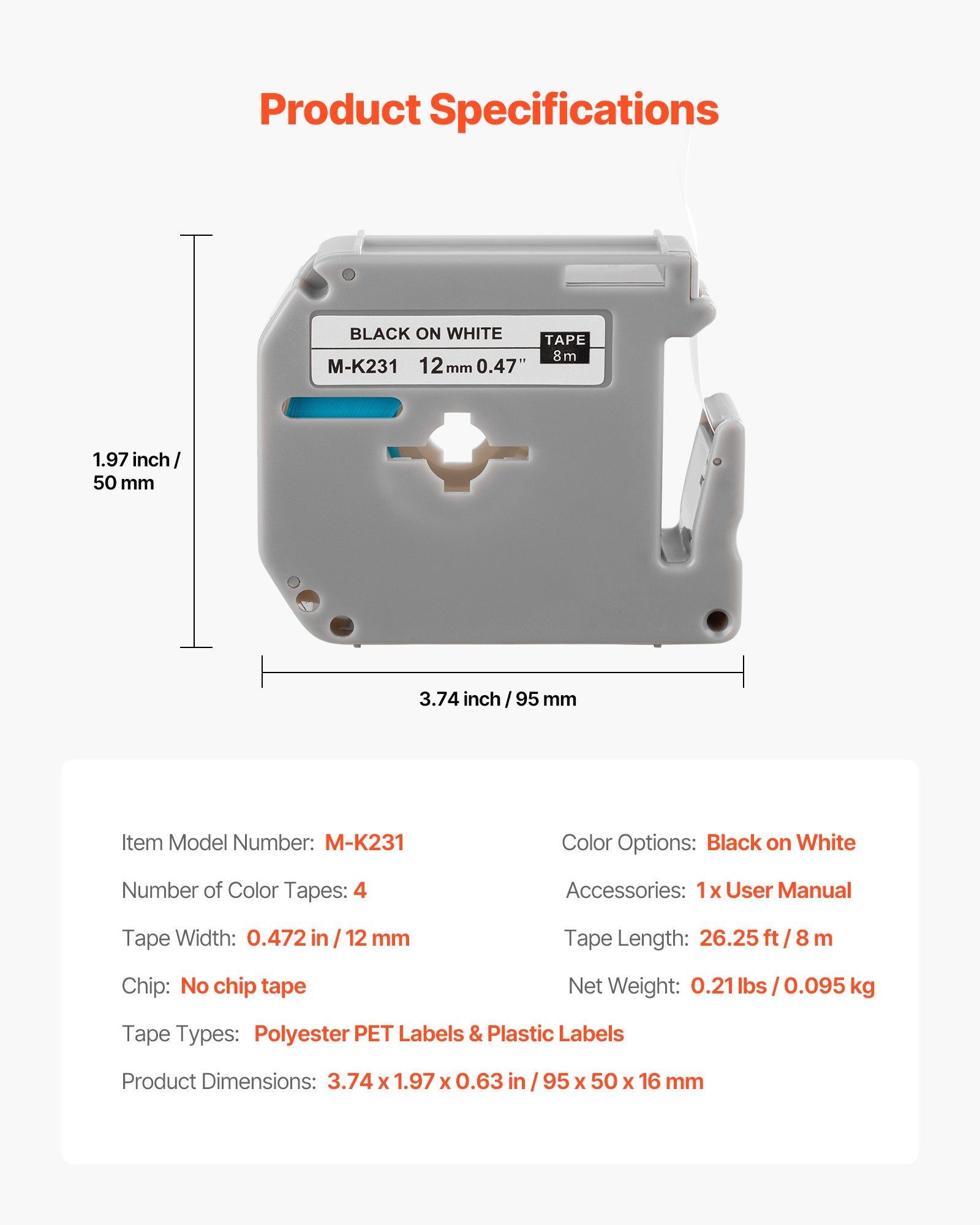Etikettenband, 4er-Pack, 12 mm (0,47 Zoll) Schwarz auf Weiß, kompatibel mit verschiedenen Brother-Etikettendruckern, strapazierfähig und langlebig, wasserfest, Ersatz für Letra Tag M-K231