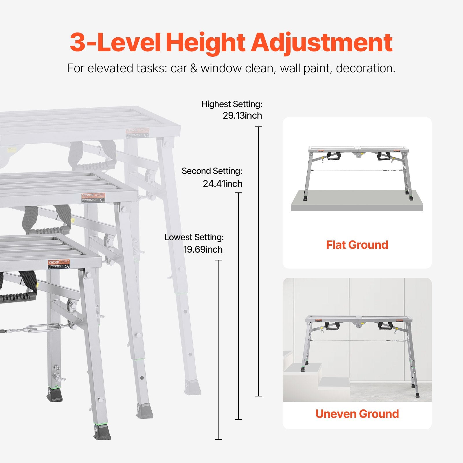 - Höhenverstellbar für maximale Flexibilität: Die Gerüstplattform bietet drei Höheneinstellungen: 5 cm, 6,2 cm und 74 cm. Dank dieser Anpassungsfähigkeit können Sie unterschiedlichste Aufgaben – von der Autowäsche bis hin zu Gebäudesanierungen – mühelos und sicher bewältigen.