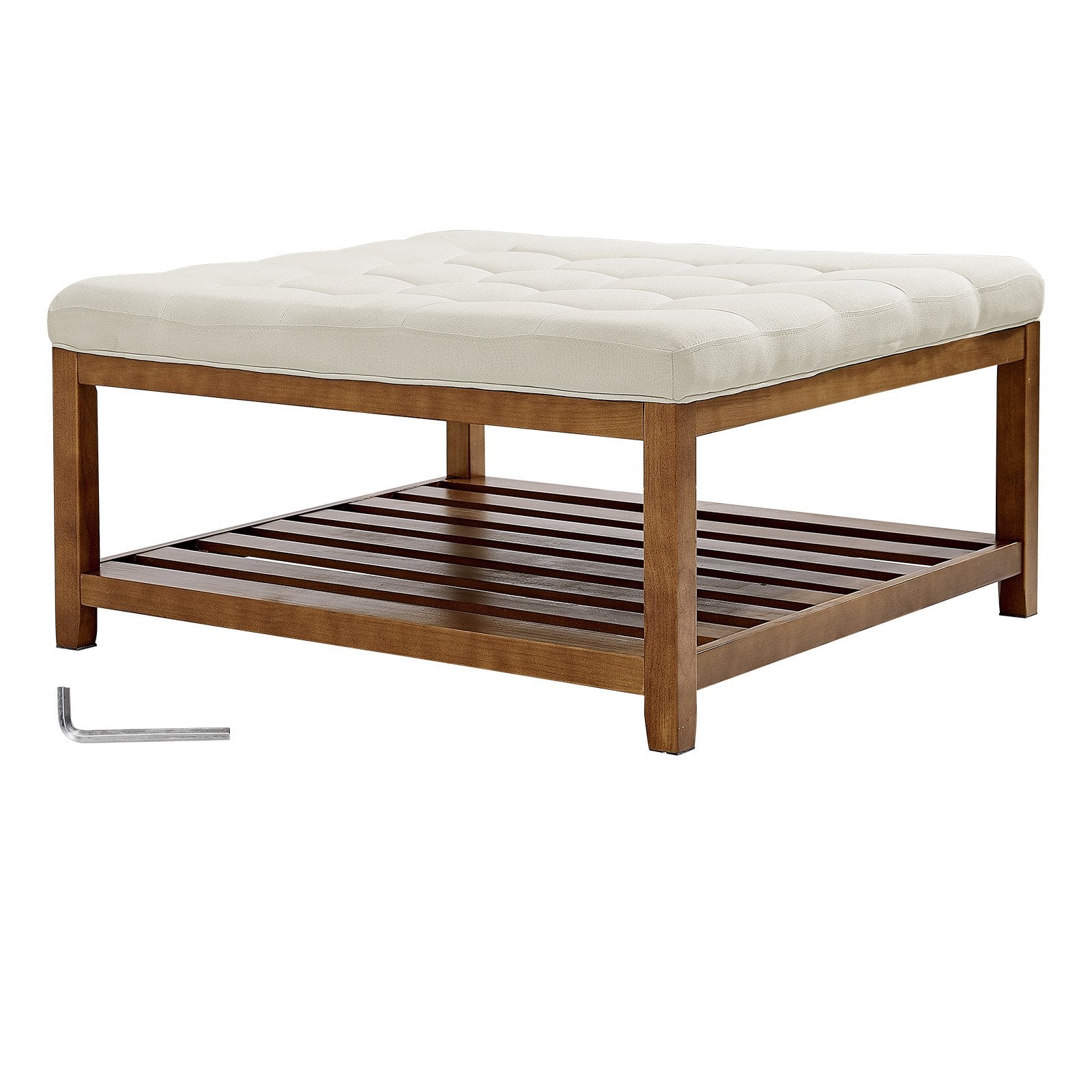 VEVOE Großer quadratischer Ottomanen-Couchtisch, 87,5 cm, gesteppter Couchtisch mit Ablagefach aus Massivholz, gepolsterter Ottoman mit Leinenbezug für Schlaf- und Wohnzimmer, 181 kg Tragkraft, Cremeweiß
