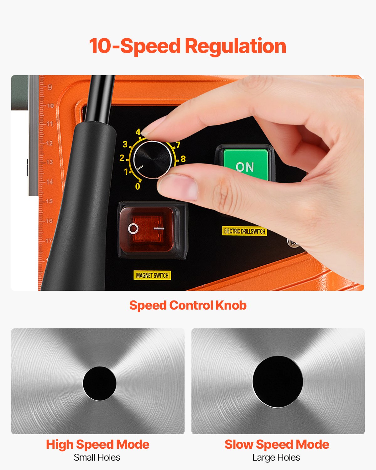 - Erleben Sie die Kraft: Die elektromagnetisch verstärkte, verdickte Basis mit Ankern aus reinem Eisen erzeugt eine enorme Kraft von 13.000 N. So arbeitet die Magnetbohrmaschine in jedem Winkel stabil und zuverlässig. Zehn einstellbare Geschwindigkeitsstufen ermöglichen präzises und effizientes Arbeiten bei unterschiedlichen Bohrdurchmessern.