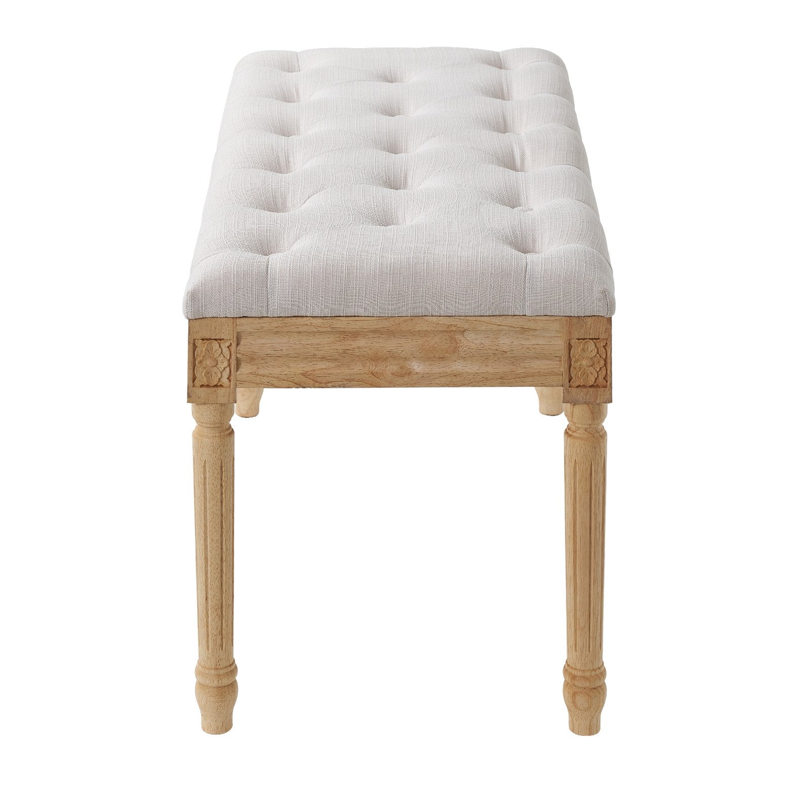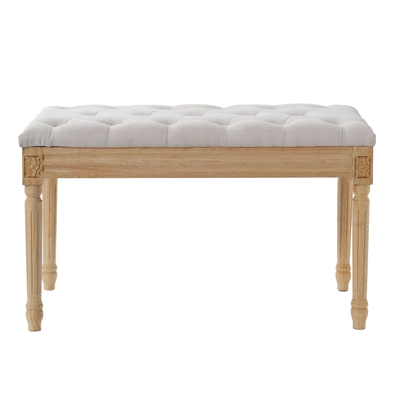 - Hochwertige Verarbeitung, elegant verziert: Die Sitzfläche der Schlafzimmerbank besticht durch eine schlichte und zugleich ansprechende Knopfheftung. Das Sitzkissen aus Memory-Schaum sorgt für optimale Rückstellkraft und hohen Sitzkomfort. Die Massivholzbeine sind mit aufwendigen Vintage-Mustern verziert und verleihen Ihrem Zuhause eine geschmackvolle Note. Gummifüße schützen Ihren Boden vor Kratzern und dämpfen die Geräusche beim Verschieben der Bank.