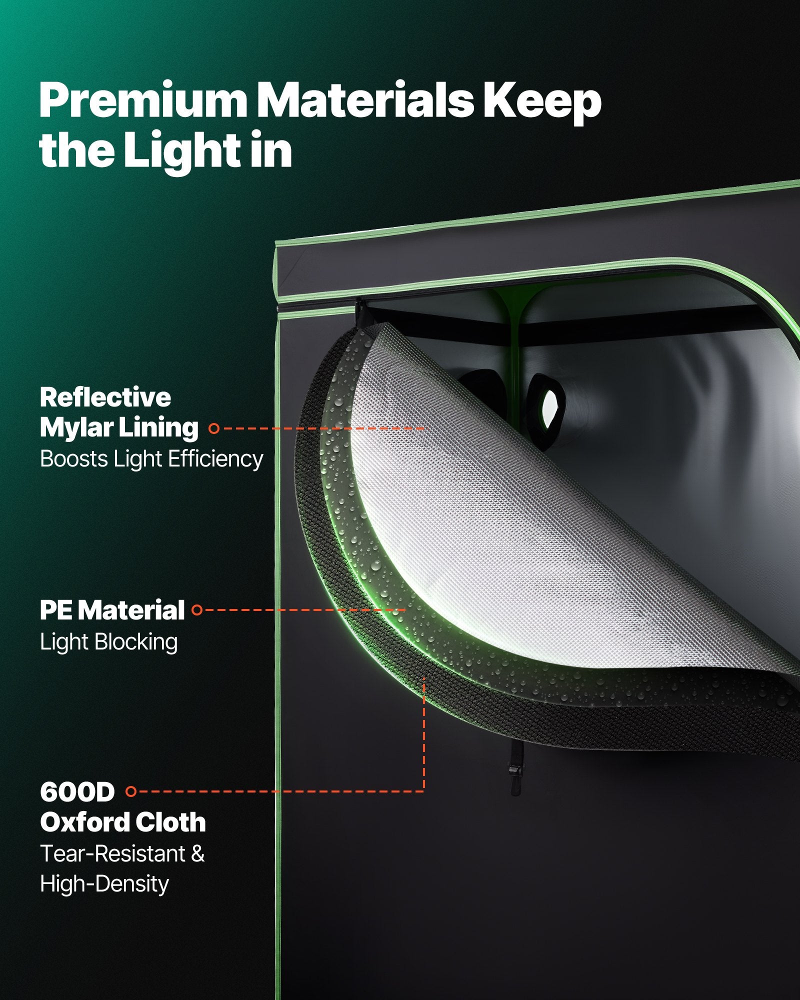 - 100 % reflektierende Innenseite: Die Innenseite ist mit einer Polyesterfolie ausgekleidet, die die Lichtreflexion maximiert und den Wärmeverlust minimiert, wodurch ein gesünderes Pflanzenwachstum gefördert wird. Die Außenseite besteht aus strapazierfähigem, reißfestem und lichtundurchlässigem 600D-Oxford-Gewebe. Reißverschlüsse mit doppelter schwarzer Futterung dichten zuverlässig ab.