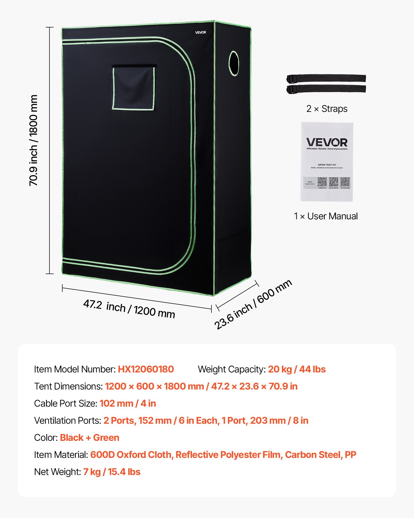 - Zeltabmessungen: 1200 x 600 x 1800 mm / 47,2 x 23,6 x 70,9 Zoll