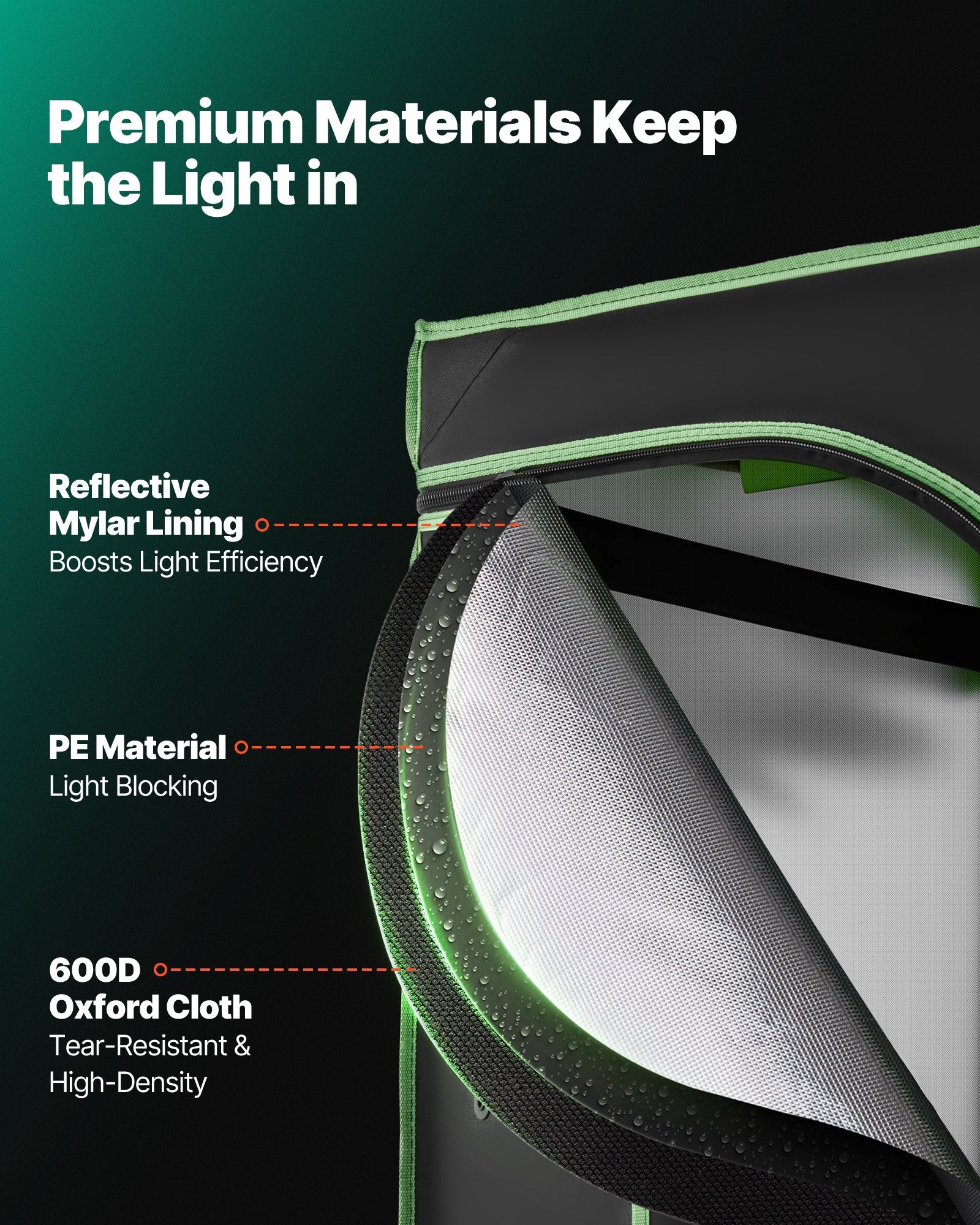 - 100 % reflektierende Innenseite: Die Innenseite ist mit einer Polyesterfolie ausgekleidet, die die Lichtreflexion maximiert und den Wärmeverlust minimiert, wodurch ein gesünderes Pflanzenwachstum gefördert wird. Die Außenseite besteht aus strapazierfähigem, reißfestem und lichtundurchlässigem 600D-Oxford-Gewebe. Reißverschlüsse mit doppelter schwarzer Futterung dichten zuverlässig ab.