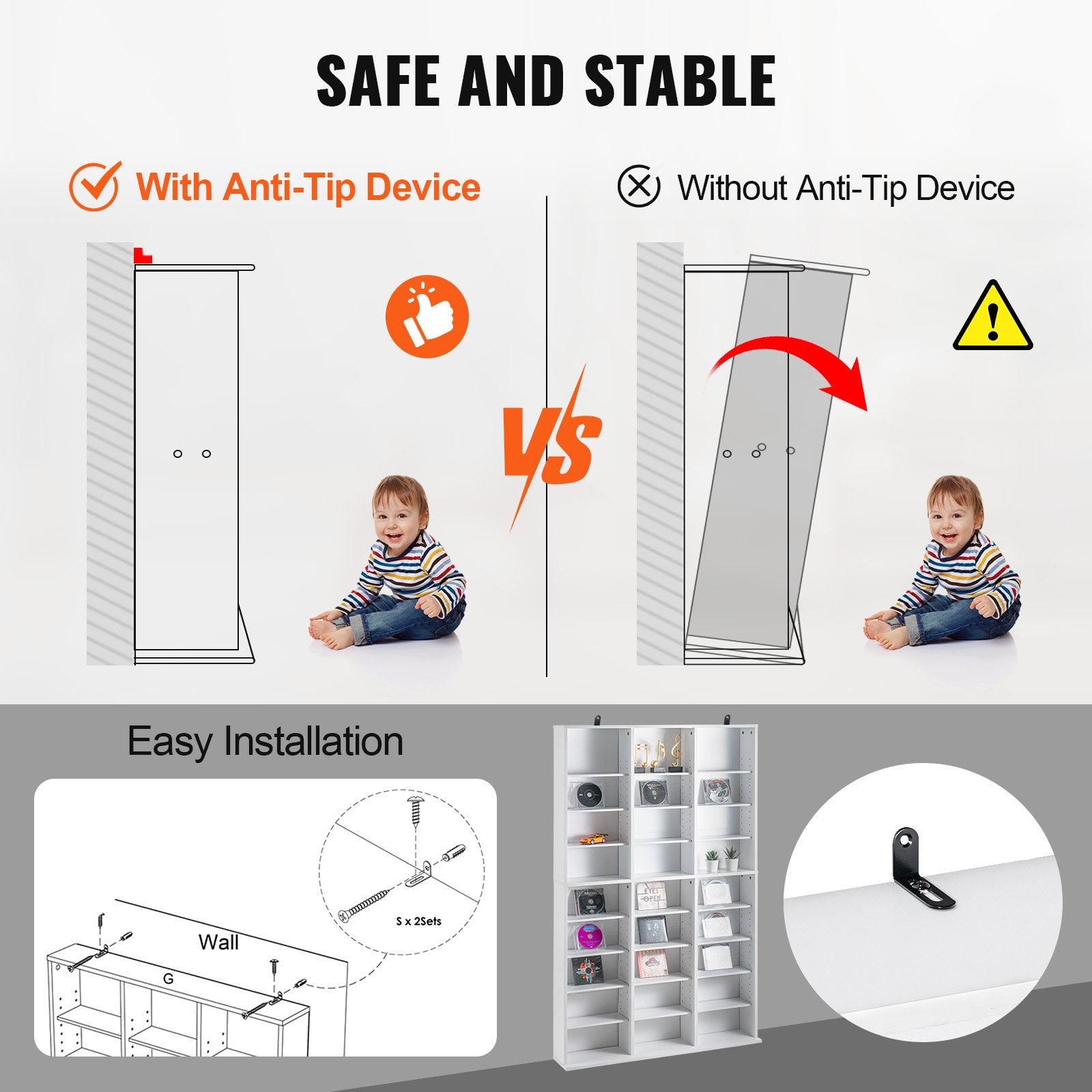 - Stabiles Design: Unser DVD-Regal verfügt über einen verbreiterten Standfuß für erhöhte Stabilität und verhindert Wackeln. Dank der Kippsicherung ist es vor versehentlichen Stößen geschützt und Ihre DVD-Sammlung bleibt im Alltag sicher.