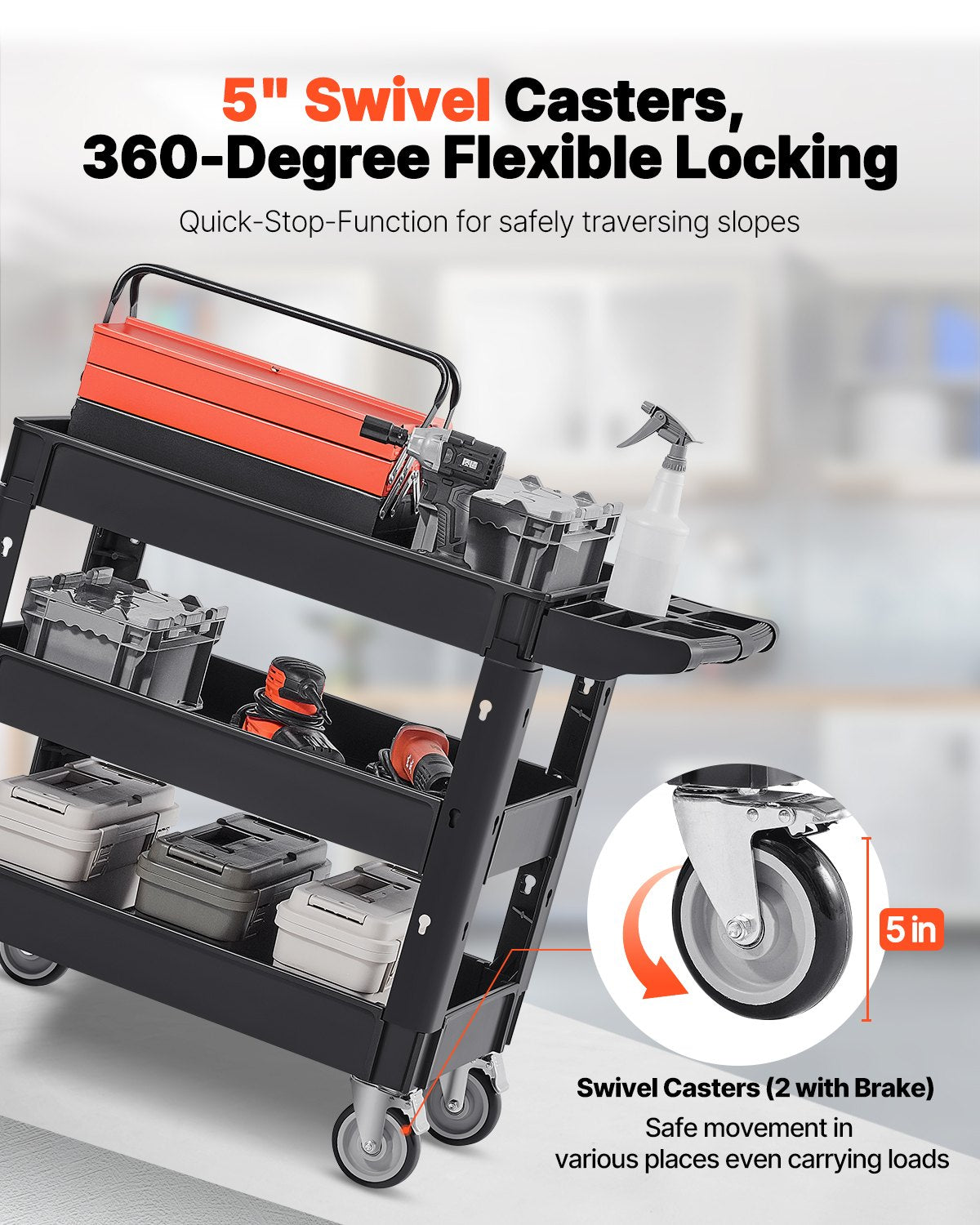 - Feststellbare Lenkrollen: Große Lenkrollen mit 12,7 cm Durchmesser (5 Zoll) ermöglichen eine flexible 360°-Feststellung. Zwei der Rollen verfügen über zuverlässige Bremsen und eine Schnellstoppfunktion für sicheren und stabilen Transport auch an Steigungen und in Kurven. Der Wagen lässt sich selbst auf engstem Raum mühelos manövrieren. Hochwertige PVC-Räder absorbieren Stöße und sorgen für einen leisen Lauf ohne Kratzer auf dem Boden. Ideal für Lagerhallen, Garagen, Büros, Gärtnereien, Hotels oder überall dort, wo Transportbedarf besteht.
