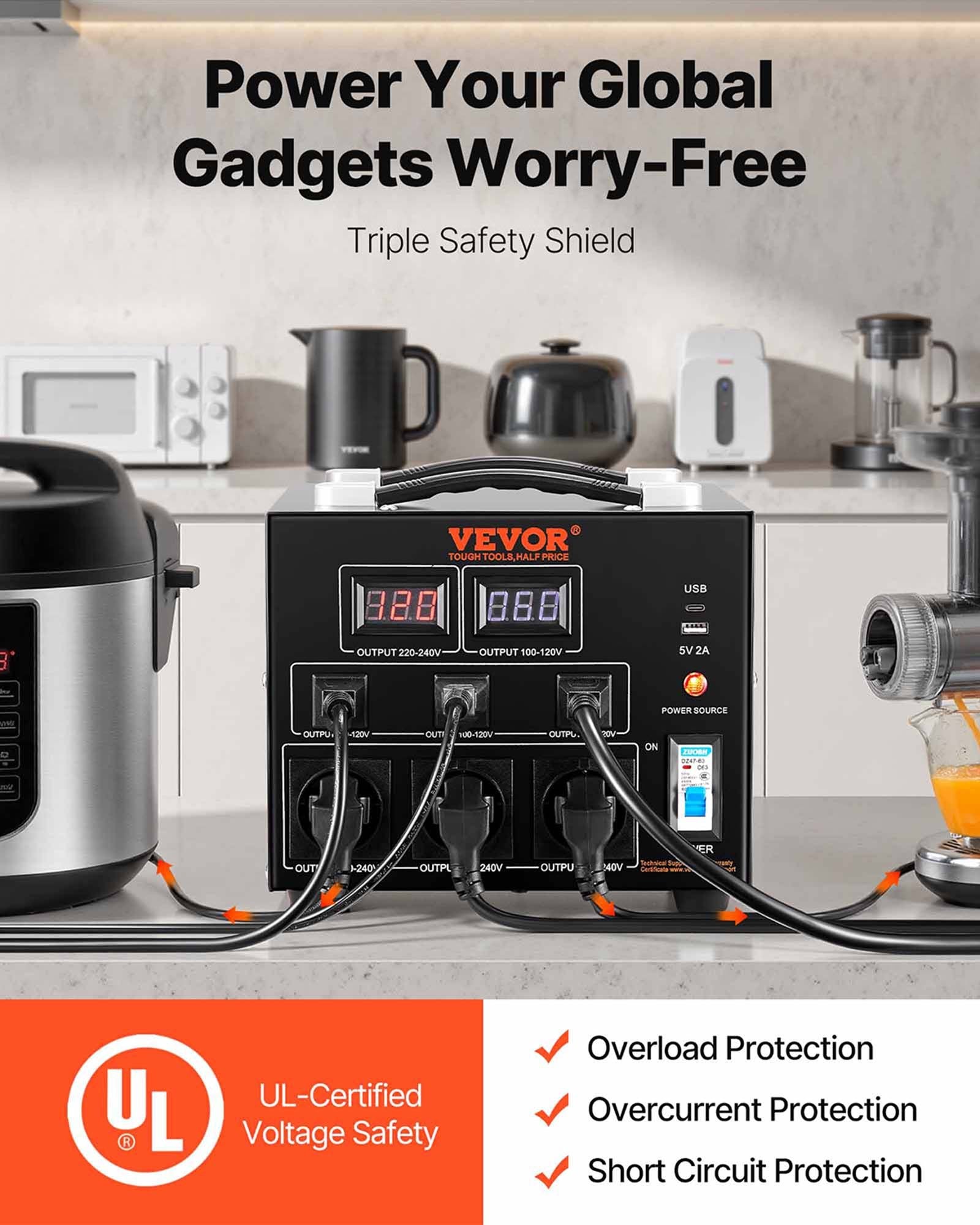 - 5000-W-Spannungswandler-Transformator: Dieser Auf- und Abwärtstransformator verfügt über 6 Netzstecker, darunter 3 US-amerikanische NEMA 5-15R 3-Pin-Ausgangsbuchsen, 3 europäische Schuko-Ausgangsbuchsen, 1 5-V-USB-Anschluss und 1 USB-C-Buchse. Er ist mit 2 LED-Anzeigen ausgestattet, die die aktuelle Ausgangsspannung in Echtzeit anzeigen, um eine Überlastung des Transformators zu vermeiden.