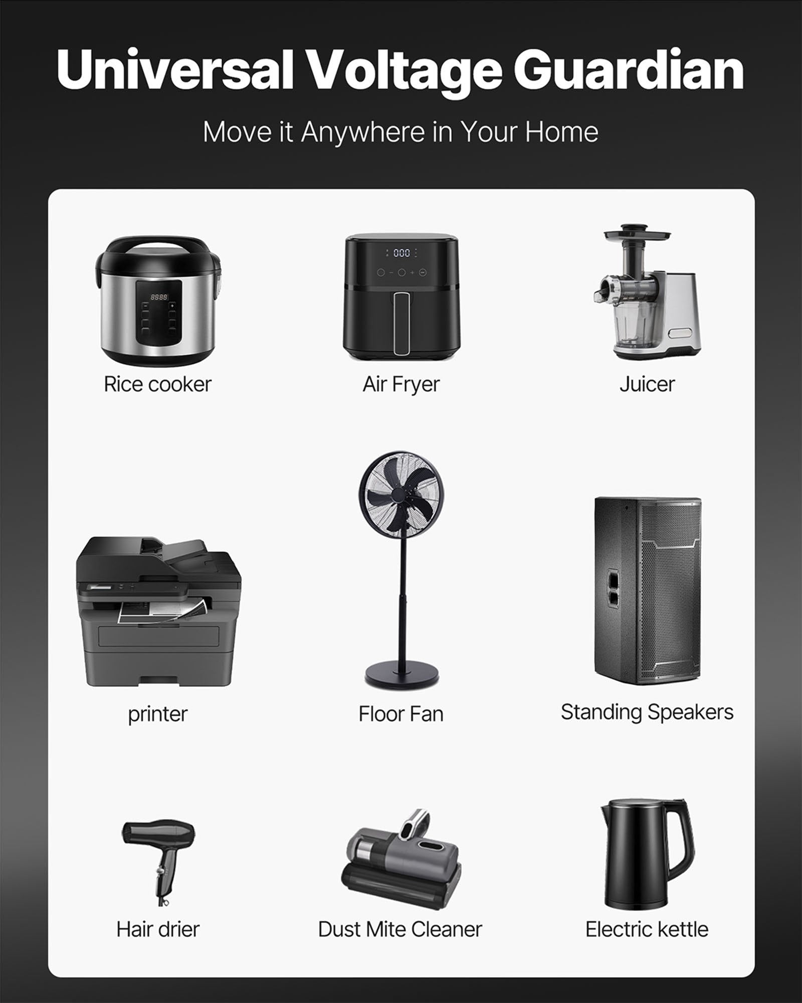- Fortschrittliche Auf-/Abwärtswandlertechnologie: Durch Umschalten der Eingangsspannung können Sie die Spannung von 110 V auf 220 V erhöhen oder von 220 V auf 110 V verringern. Bitte stellen Sie vor dem Einschalten die korrekte Spannung ein. Dank des universellen Netzanschlusses können Sie ein separates Netzkabel erwerben und das Gerät je nach Land an die entsprechende Buchse anschließen.
