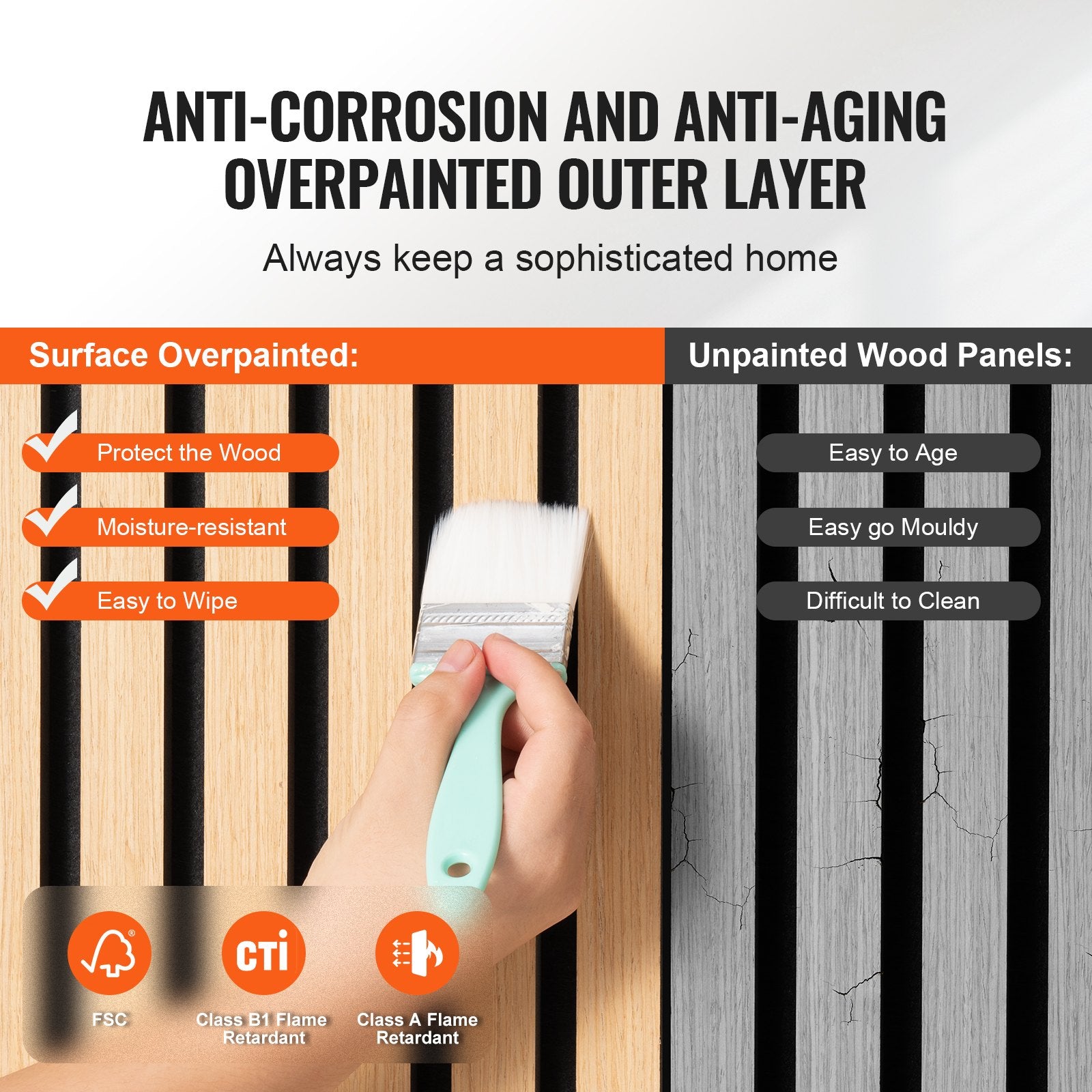 - MDF-Streifen der Klasse E0: Diese Akustikwandpaneele bestehen aus drei Schichten: einer Holzmaserung-Laminatschicht, MDF-Platten und hochdichten Polyesterfasern. Dank ihrer Formaldehydemissionen gemäß E0-Norm und der Brandschutzklasse A gewährleisten sie eine sichere und umweltfreundliche Nutzung.