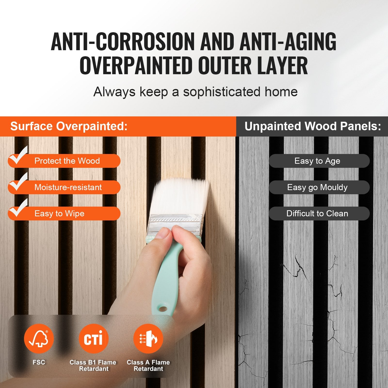 - Anti-Aging-Beschichtung: Die Außenschicht ist mit einer korrosionsbeständigen Anti-Aging-Beschichtung versehen, die den FSC- und B1-Brandschutzstandards entspricht. Dies erhöht nicht nur die Langlebigkeit des Holzes, sondern sorgt auch für optimale Sicherheit in Ihrem Zuhause und erleichtert die tägliche Reinigung.