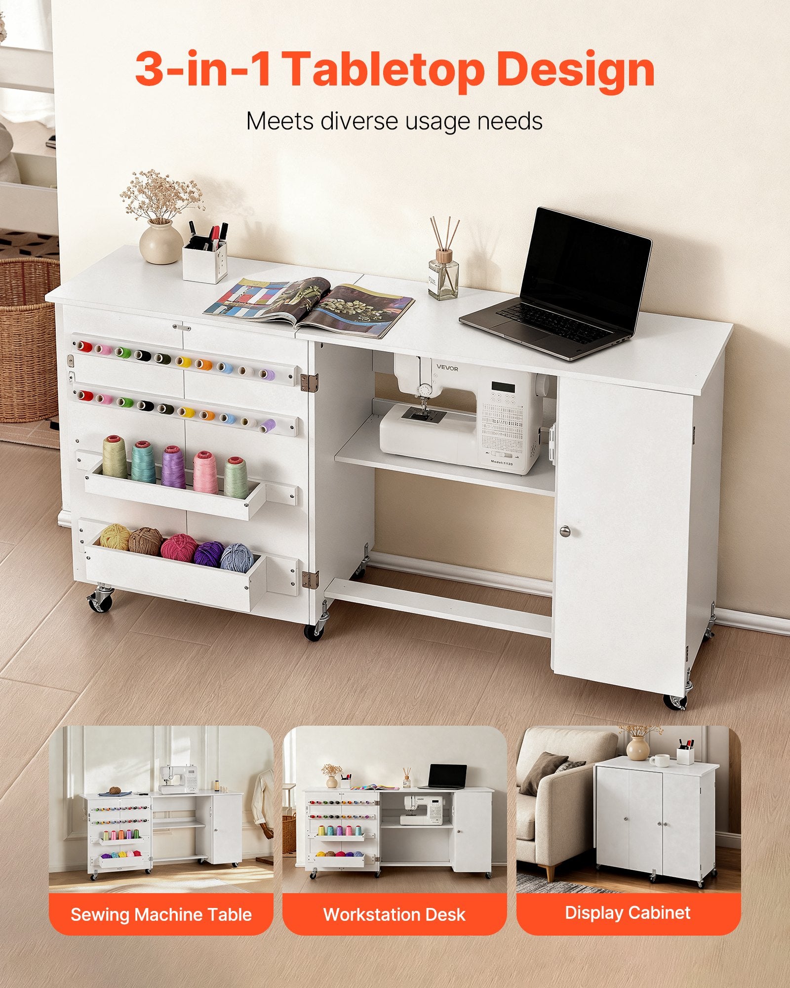 Klappbarer Nähtisch, vielseitiger Nähmaschinentisch mit Schrank, kompaktes Design, Rollen, Holzstifte, Ablagefächer und Regal, Magnettür, Bastelstation und Beistelltisch für Zuhause, Weiß