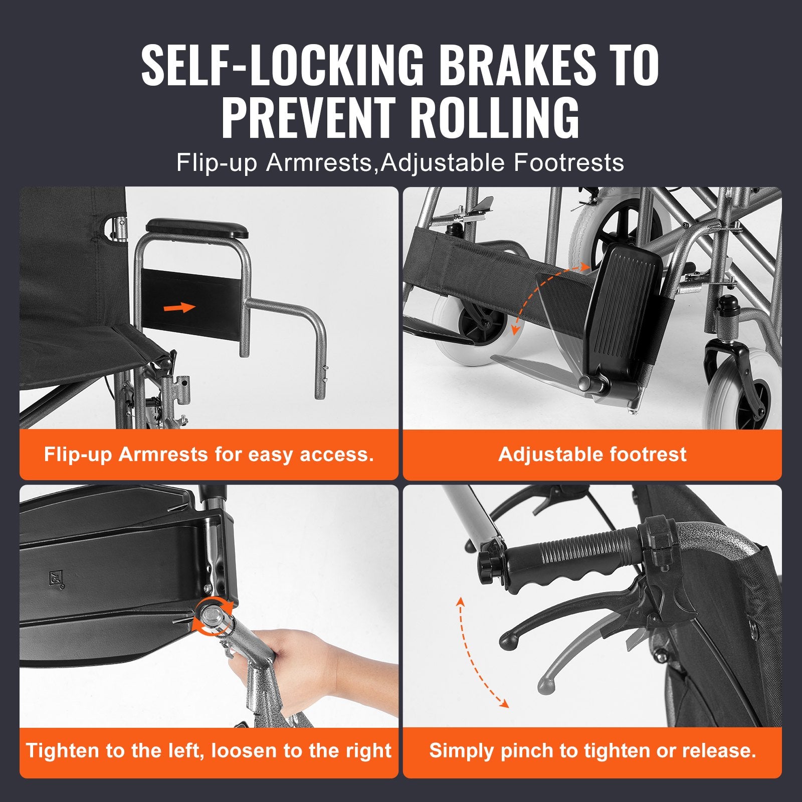 Rollstuhl, Transportrollstuhl aus Kohlenstoffstahl für Erwachsene, faltbarer Rollstuhl mit abnehmbarer Armlehne, selbstblockierender Bremse, 61 cm breiter Sitz, Tragkraft 136 kg, für Menschen mit Behinderungen, die sich frei bewegen möchten