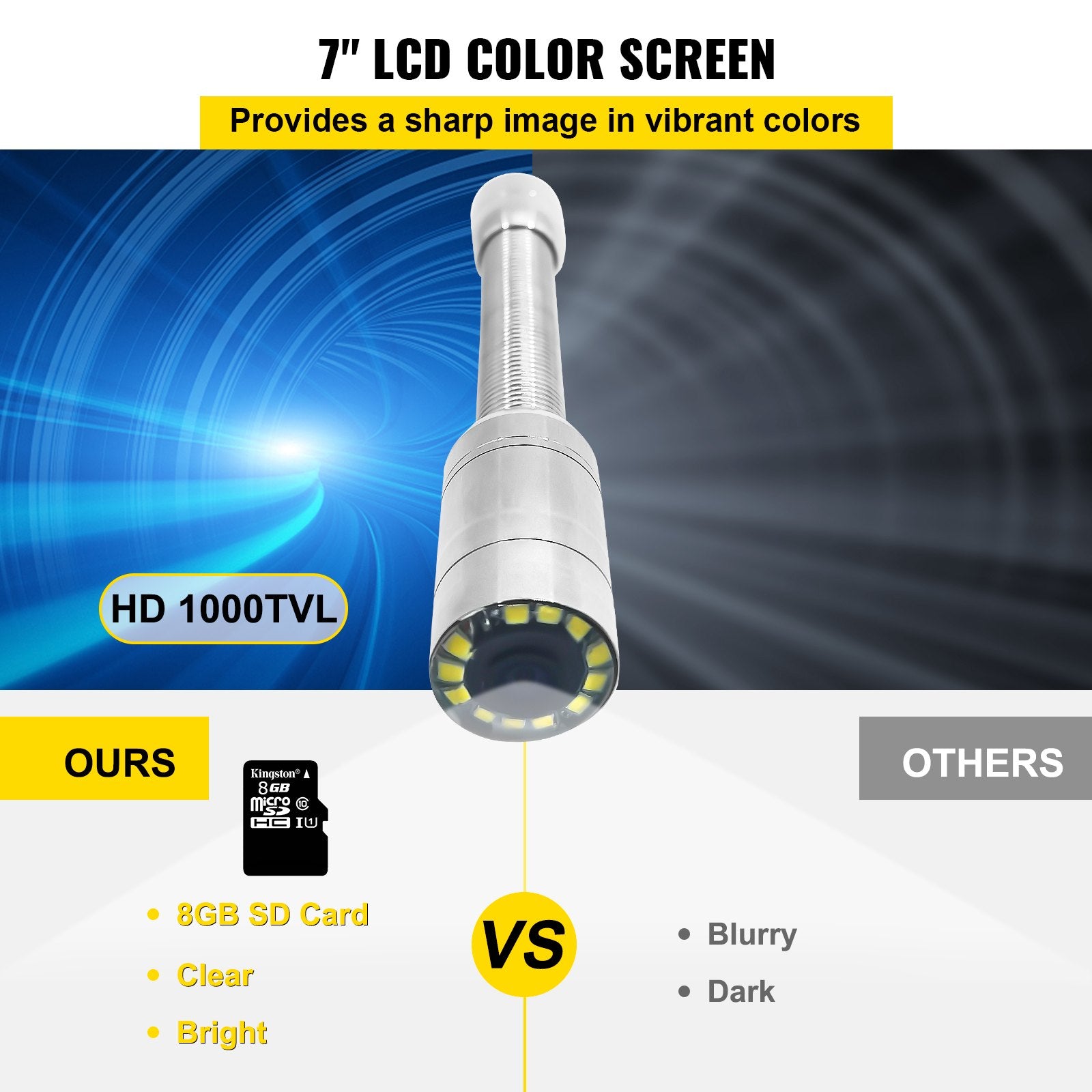 - Hochwertiger 7-Zoll-Farb-TFT-LCD-Bildschirm: Sorgt für klare und farbenfrohe Bilder. Wir haben für Sie einen 7-Zoll-LCD-Monitor bereitgestellt. Er bietet ein beeindruckendes Farberlebnis und einen großen Betrachtungswinkel – zwei seiner herausragenden Merkmale. Darüber hinaus verfügt die Inspektionskamera über eine DVR-Funktion und eine 8-GB-Micro-SD-Karte (im Lieferumfang enthalten), mit der Sie Bilder aufzeichnen und zur späteren Verwendung und Analyse speichern können.
