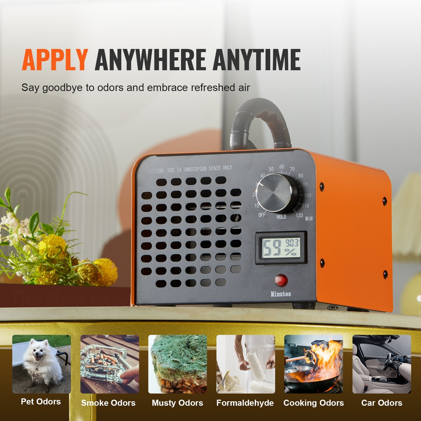 - Intelligente Zeitsteuerung: Dieses gewerbliche Ozongeneratorgerät verfügt über eine Feuchtigkeitsanzeige und eine Timerfunktion (0–120 Minuten). Sie können die gewünschte Betriebszeit auf bis zu 120 Minuten einstellen und den „HOLD“-Modus für Dauerbetrieb nutzen. Die Feuchtigkeitsanzeige erinnert Sie daran, für eine optimale Geruchsbeseitigung die Raumluft trocken zu halten.
