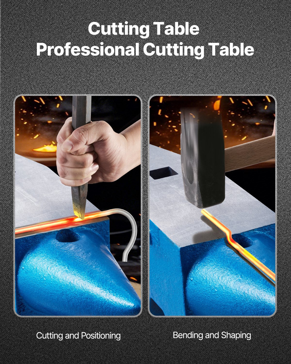 - Löcher und Hörner für verschiedene Zwecke: Runde und flache Ambosshörner dienen zum Glätten, Biegen und Formen. Harte Löcher und Pritchellöcher eignen sich gut zum Stanzen und Verdrehen von Zubehör.