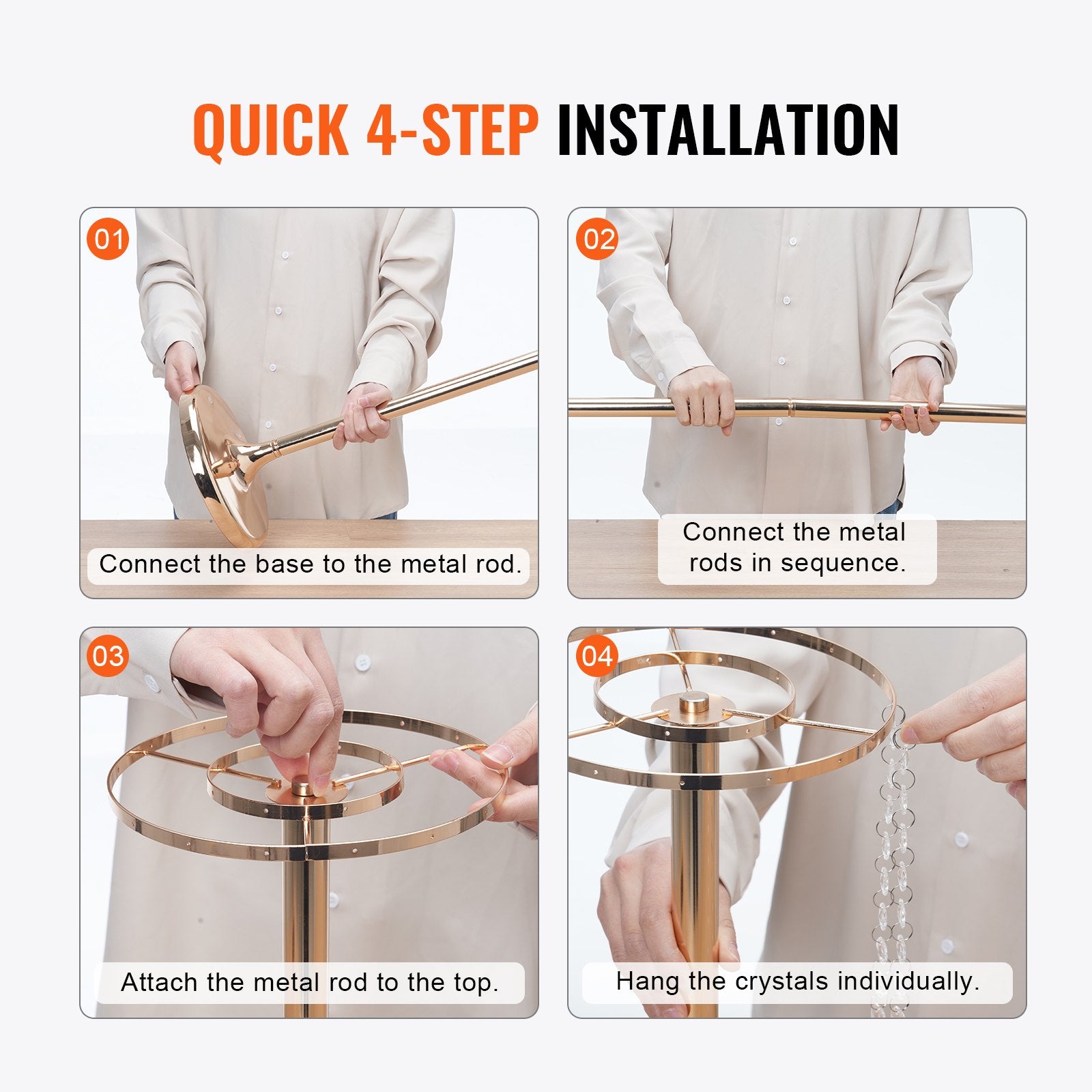 - Einfache Montage: Der Aufbau dieses Kristallblumenständers ist kinderleicht und werkzeuglos und erfordert nur vier Schritte: Schritt 1 – Verbinden Sie den Sockel mit der Metallstange. Schritt 2 – Setzen Sie die Metallstangen nacheinander zusammen. Schritt 3 – Verbinden Sie die Metallstange mit dem Oberteil. Schritt 4 – Bringen Sie die Kristalle einzeln an. Die Montage ist in wenigen Minuten erledigt.