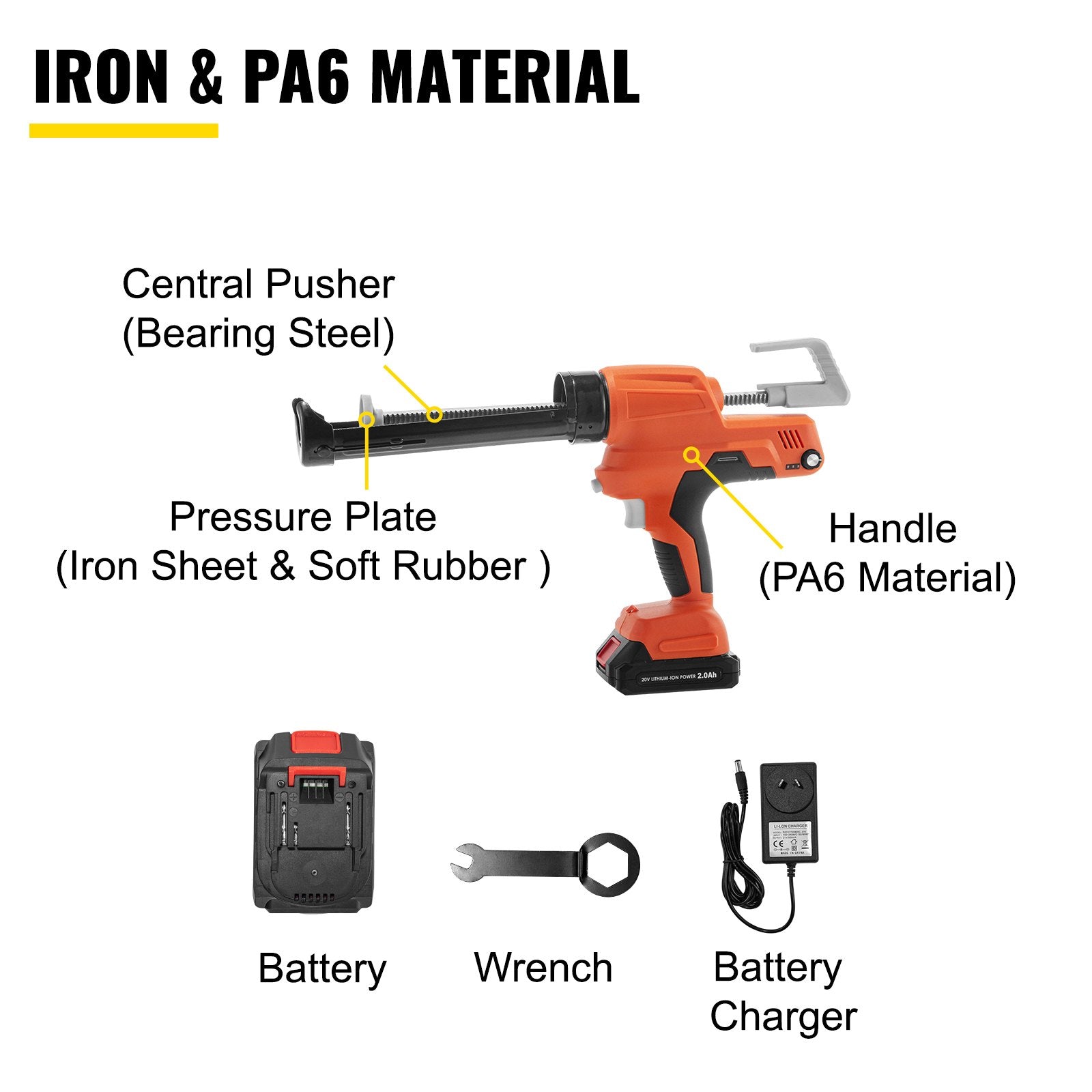 - Premium-Qualität: Der Lauf der Kartuschenpistole ist aus hochwertigem Eisen gefertigt und daher leicht, robust, stabil und langlebig. Das Gehäuse der elektrischen Kartuschenpistole besteht aus PA6-Material, das sich durch eine glatte Oberfläche, hohe Zähigkeit und Verschleißfestigkeit auszeichnet. Im Lieferumfang enthalten sind ein Schraubenschlüssel, ein Hartgummi und eine Batterie.