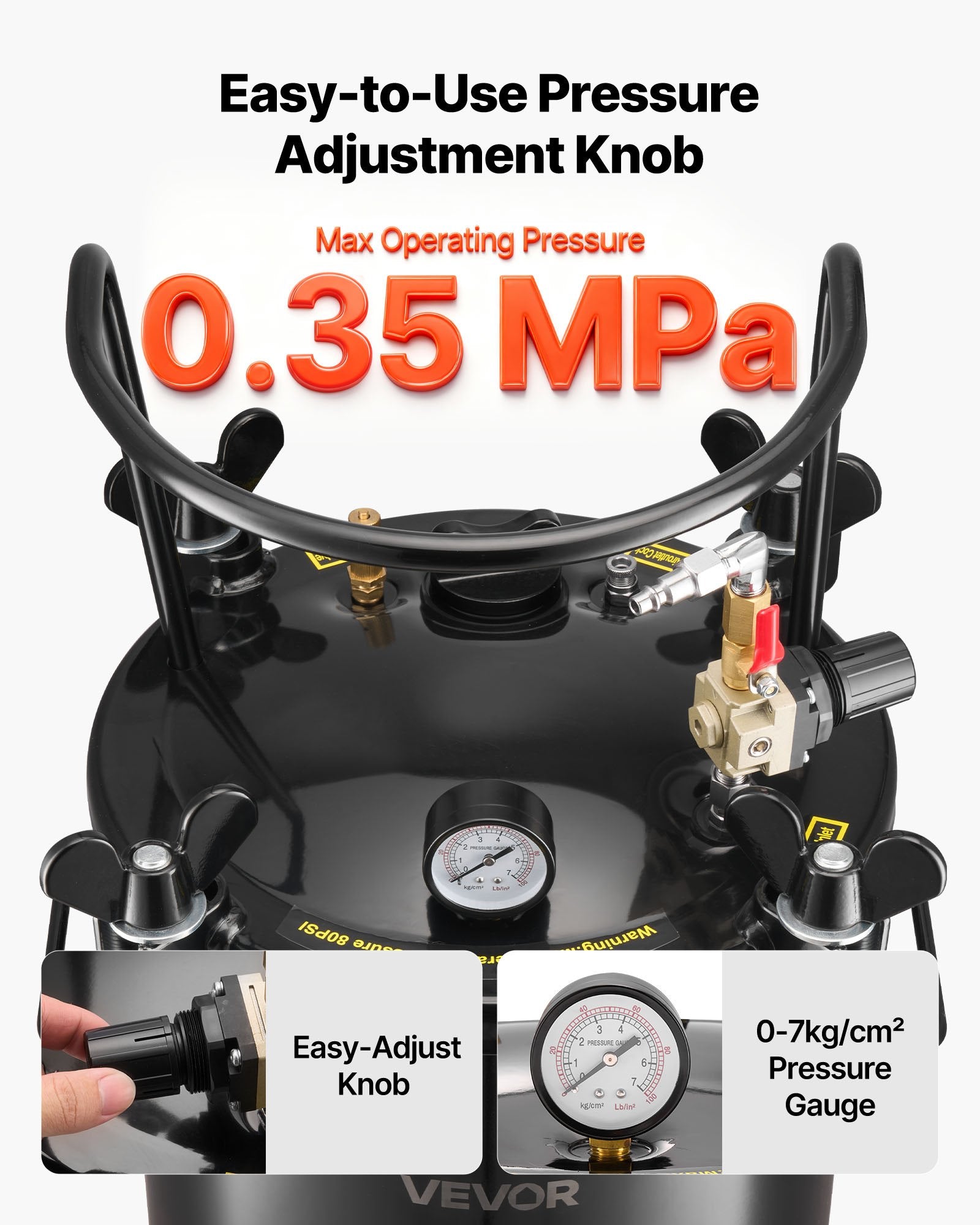 - Präzise Steuerung: Die Druckkammer ist mit einem Einstellknopf ausgestattet und ermöglicht so eine präzise Druckeinstellung, während ein Manometer den aktuellen Druck in Echtzeit anzeigt. Ein Sicherheitsventil lässt Luft ab einem Druck von 0,5 MPa ab und sorgt so für einen gleichmäßigen Druck und einen reibungslosen Betrieb bei allen Aufgaben.