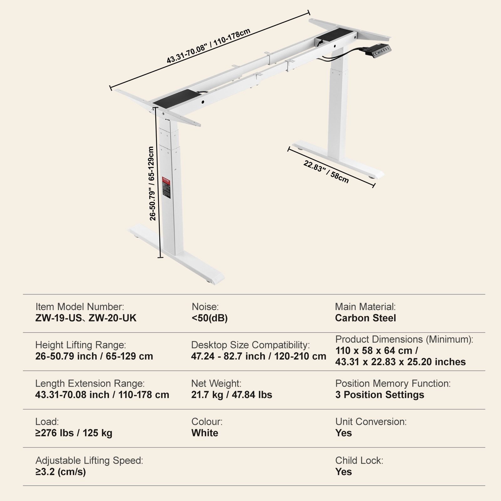 - Hubhöhenbereich: 65–129 cm / 26–50,79 Zoll