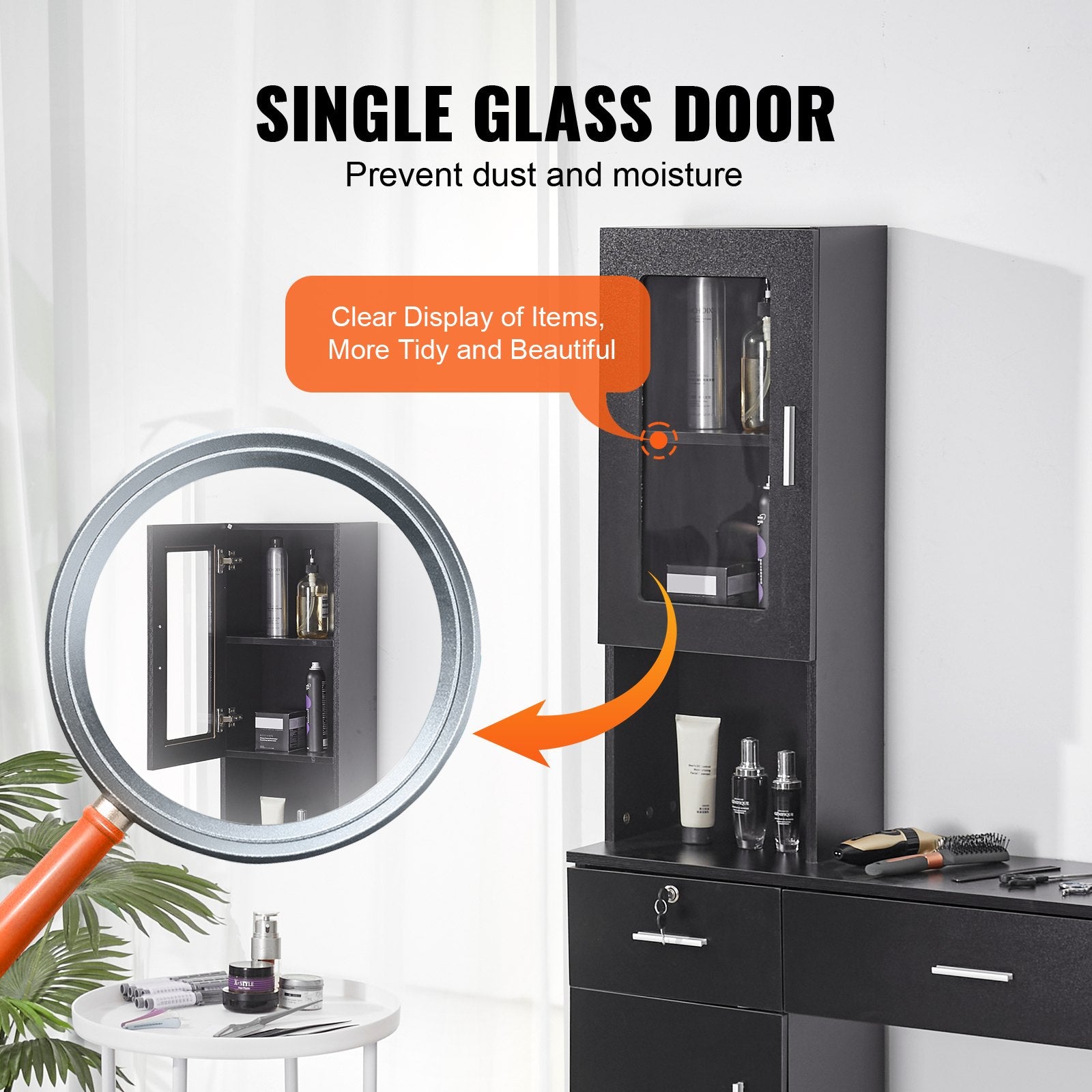 - Sicherheit und Datenschutz: Die Glastür des Schranks schützt vor Staub und Feuchtigkeit, sorgt für Sauberkeit und ein ansprechendes Erscheinungsbild. Der Friseurarbeitsplatz verfügt über eine abschließbare Schublade zur sicheren Aufbewahrung von Wertsachen.