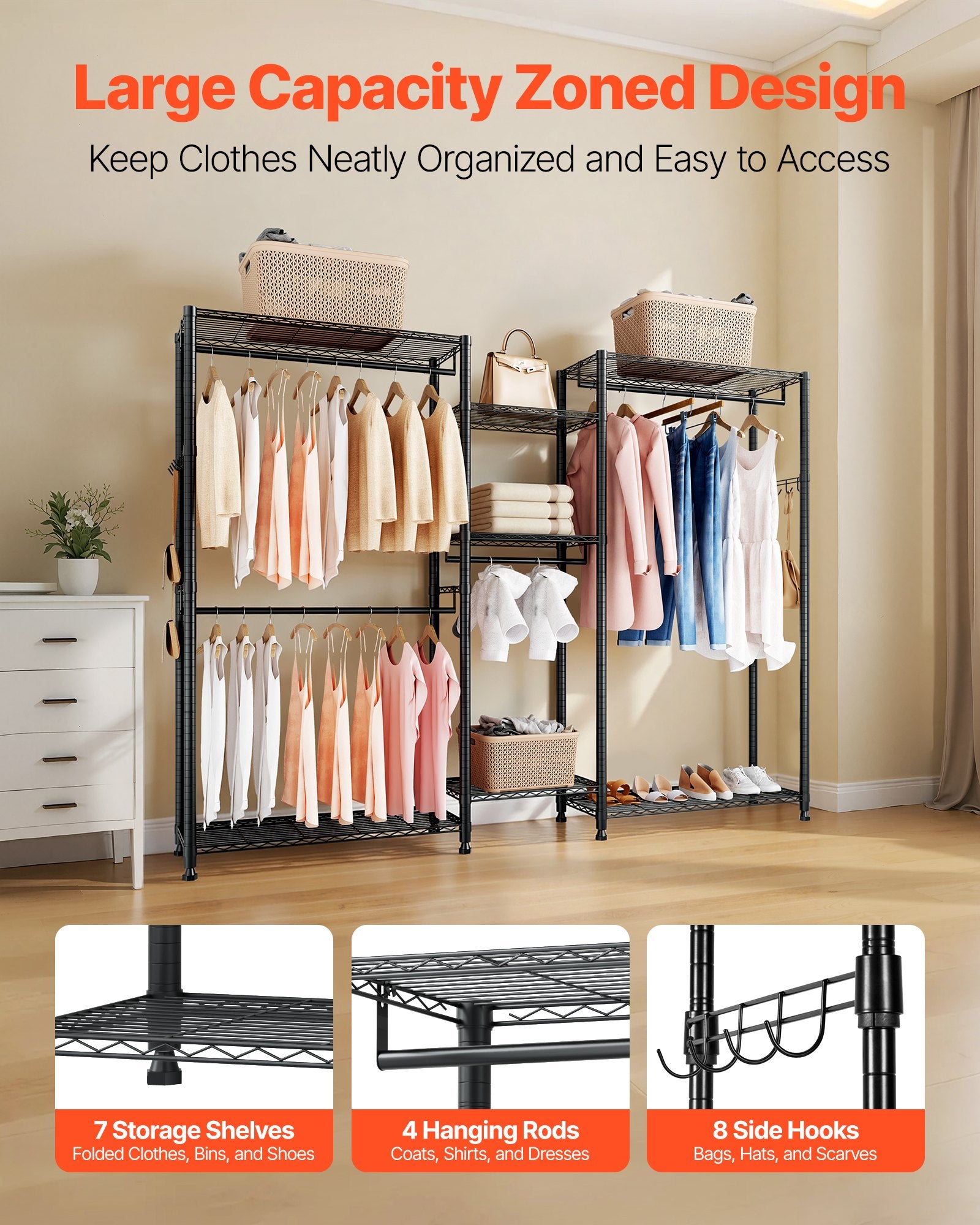 Kleiderständer, Schwerlast-Kleiderschrank, 7 verstellbare Kleiderstangen mit Stahlrahmen, Tragkraft 385,5 kg, mit 4 Kleiderstangen für Schlafzimmer, Abstellraum, Flur